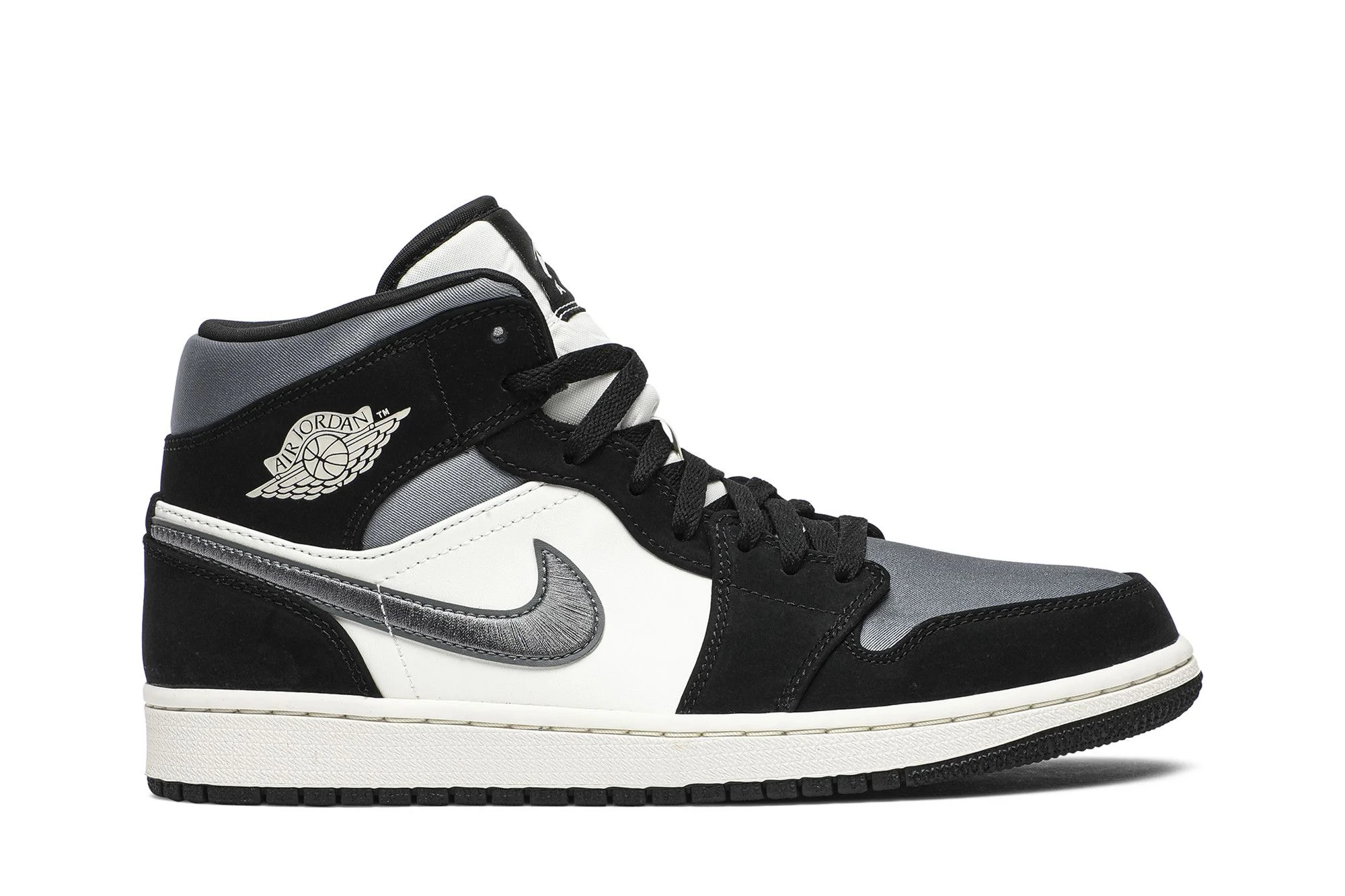The Air Jordan 1 Mid SE 'Satin Smoke Grey' showcases the timeless appeal of the AJ1 silhouette, updated here with a neutral color scheme and nontraditional materials. The upper is constructed from a blend of white leather at the quarter panel and shiny grey satin at the toe box, collar and Nike Swoosh. Black suede overlays are applied to the forefoot, heel and collar, the latter featuring a classic Wings logo on the lateral side. UPPER MATERIAL Satin