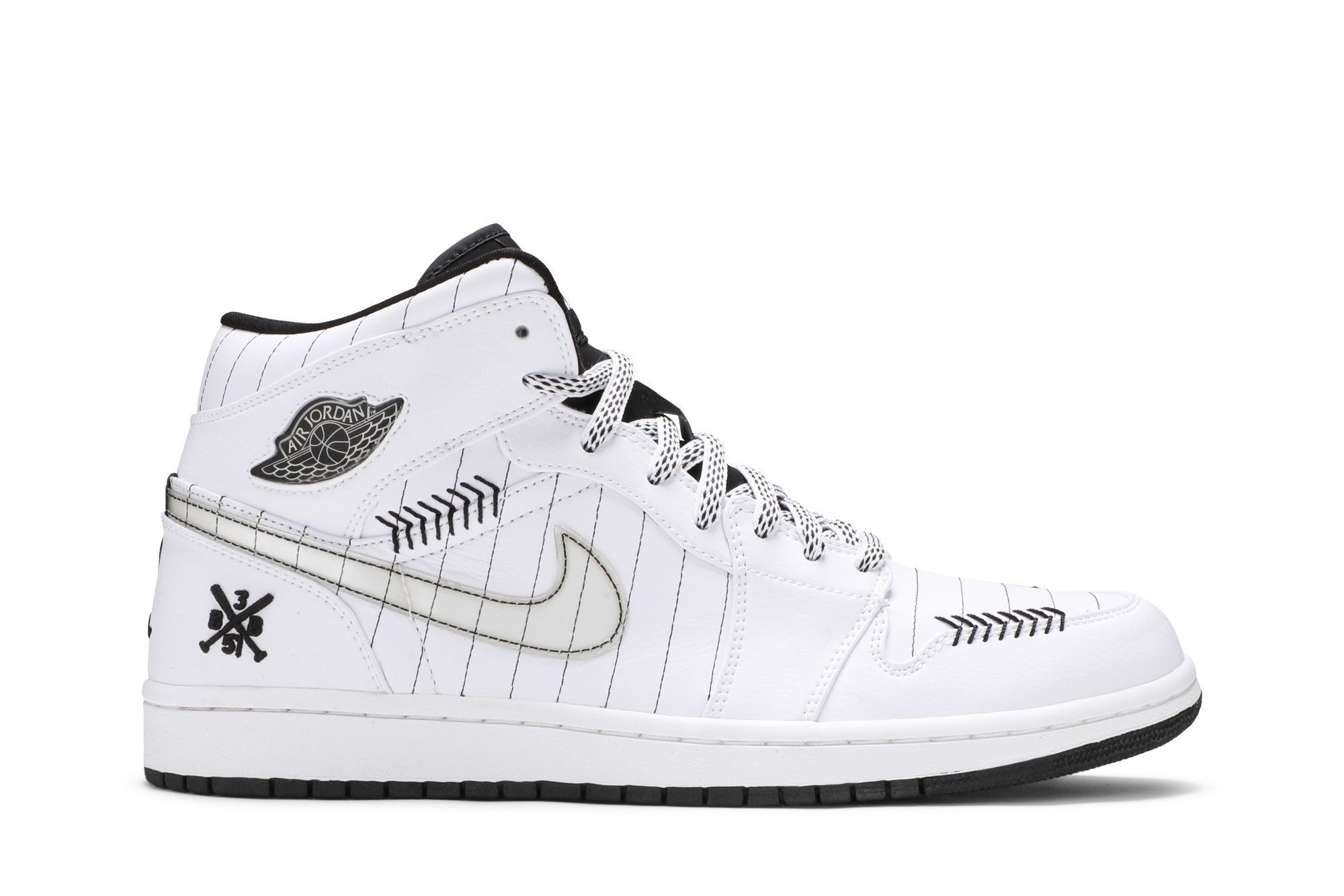 Releasing in June 2008 as part of the Opening Day pack, the Air Jordan 1 ‘Baron’ takes inspiration from Michael Jordan’s brief foray into professional baseball. The shoe’s white leather upper, accented with black pinstripes and baseball-stitch detailing, gives the nod to the home uniform of the Birmingham Barons, the Double-A Southern League team that Jordan joined in 1994. UPPER MATERIAL Leather