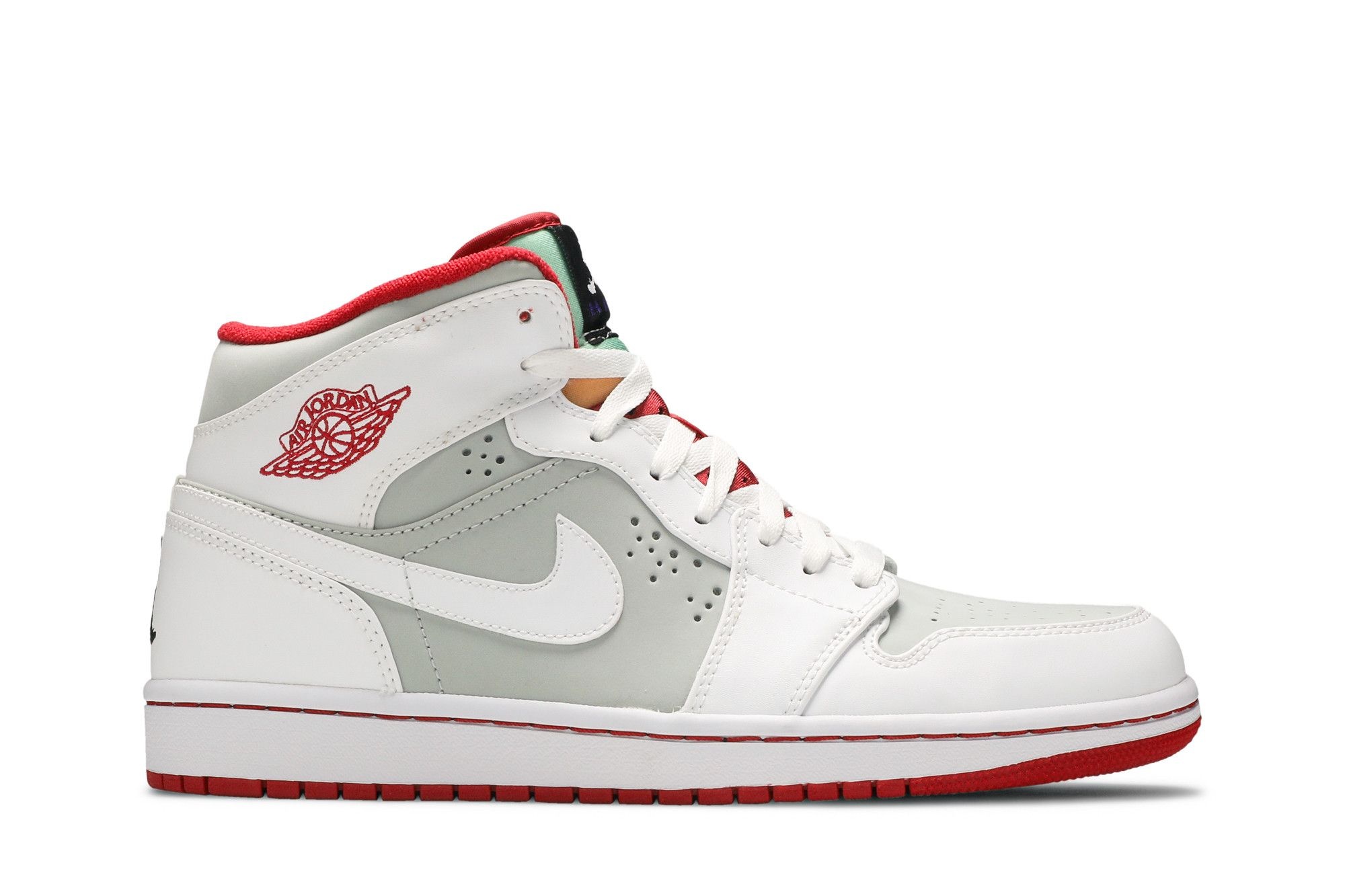 The Air Jordan 1 Retro ‘Hare’ from 2009 pays tribute to Michael Jordan’s partnership with Looney Tunes mainstay Bugs Bunny, immortalized in Jordan commercials that ran on TV sets across the country in 1992. The design takes cues from the OG Air Jordan 7 ‘Hare,’ featuring a mix of Light Silver and white with True Red accents. A woven black tongue tag atop the multicolor tongue depicts a silhouette of Bugs Bunny in the iconic Jumpman pose. UPPER MATERIAL Leather