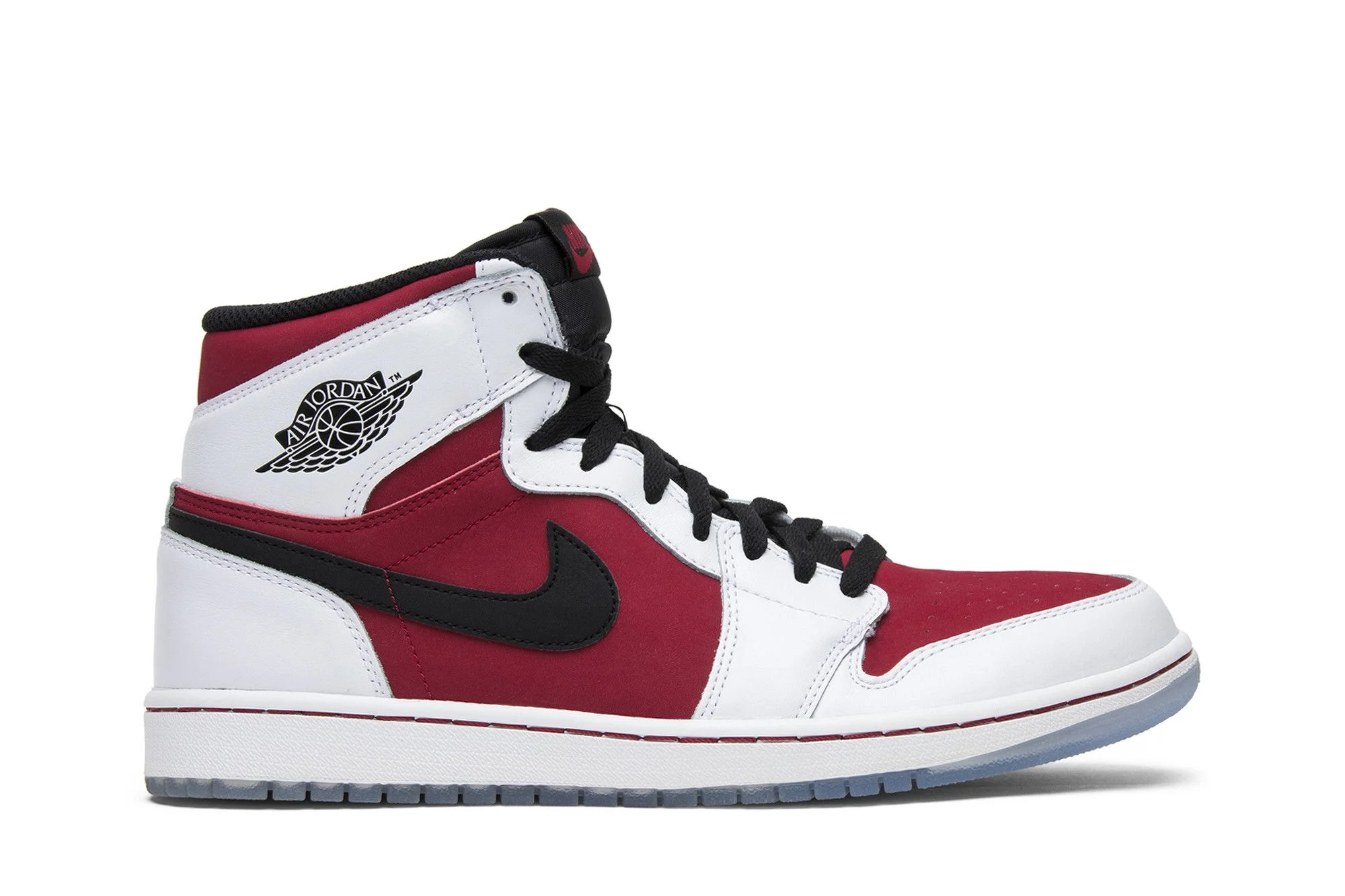 The Nike Air Jordan 1 Retro High OG 'Carmine' brings the iconic Air Jordan 6 'Carmine' colorway to the Jordan 1 silhouette. The design features a premium leather upper in shades of white, black, and Carmine Red. Released in May 2014, the shoe sits on a white midsole with red stitching and an ice blue translucent outsole. UPPER MATERIAL Leather