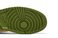The Air Jordan 1 Retro High OG ‘Craft - Celadon’ features a white leather upper with olive green suede overlays at the forefoot and heel. Vibrant hits of Bright Mandarin settle on the padded high-cut collar, interior lining and signature Swoosh, the latter enlivened with white contrast stitching. Standard branding elements include a retro Wings logo imprinted on the lateral collar flap and woven Nike Air tag atop the exposed foam tongue. An aged finish is applied to the midsole, fitted with Air-sole cushioning and reinforced by a green rubber outsole. UPPER MATERIAL Suede