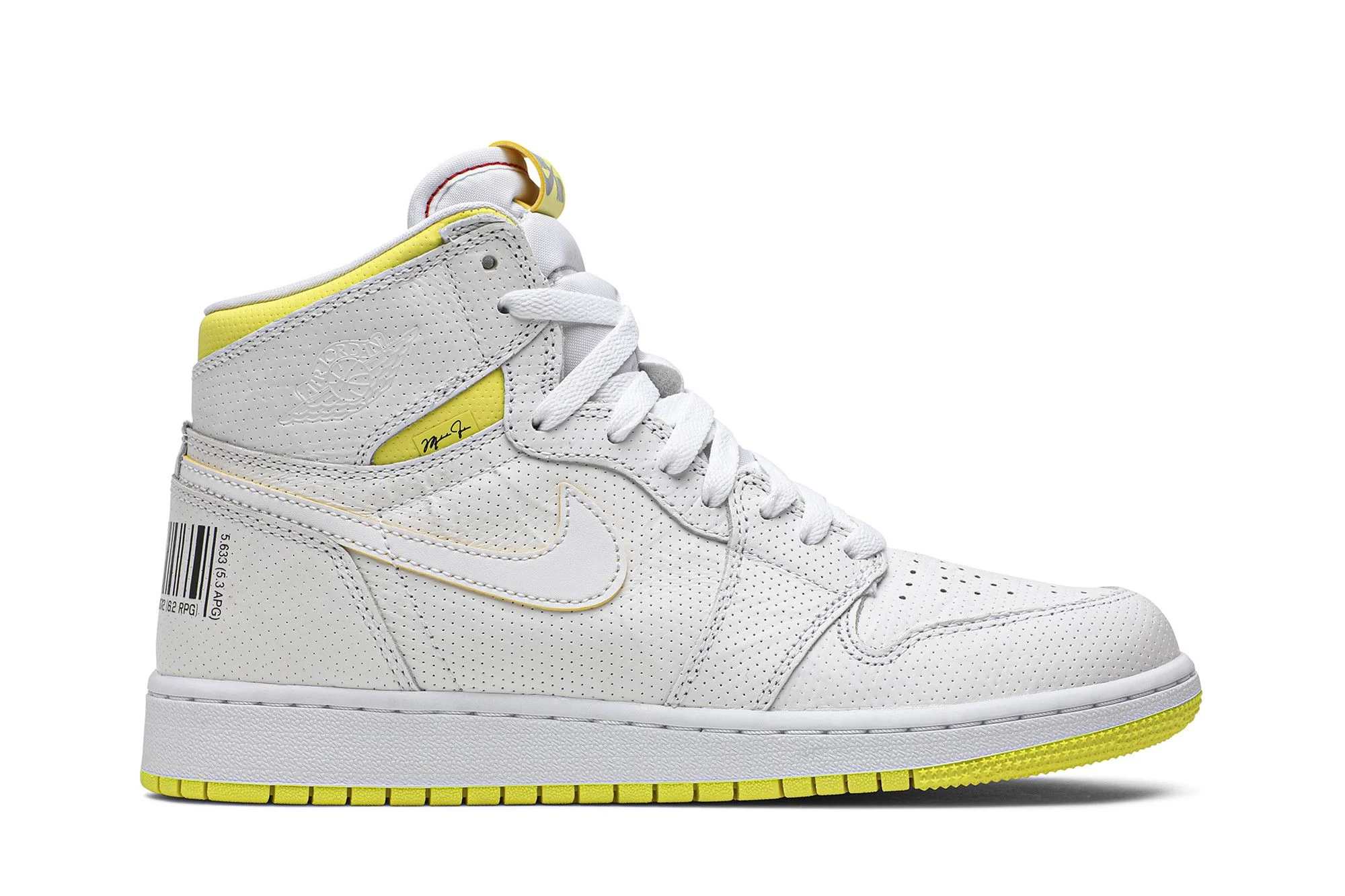 The Air Jordan 1 Retro High OG GS 'First Class Flight' high-top has a white leather upper with a perforated look and real perforation on the toe box. Markings on this Peter Moore-designed shoe include the Wings logo, first seen in 1985 with the original Air Jordan 1. This basketball shoe, released in September 2019, and has other unique visual elements, including Michael Jordan’s signature and black bar codes on the heel panel. A recycling symbol with a ‘23’ in the center pays tribute to Jordan’s jersey number. UPPER MATERIAL Leather