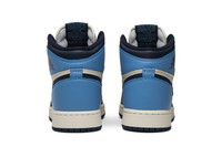 This iteration of the Air Jordan 1 is a high-top retro kids' shoe presented in Sail, Obsidian and University Blue. The sneaker released in August 2019 and it stays true to the Peter Moore-designed original, which debuted in 1985. The iconic silhouette features a leather upper with Nike branding on the tongue, the Wings logo on the ankle collar and the Nike Swoosh on the quarter panel. A perforated toe box and a rubber outsole with a pivot point tread pattern finish the style. UPPER MATERIAL Leather
