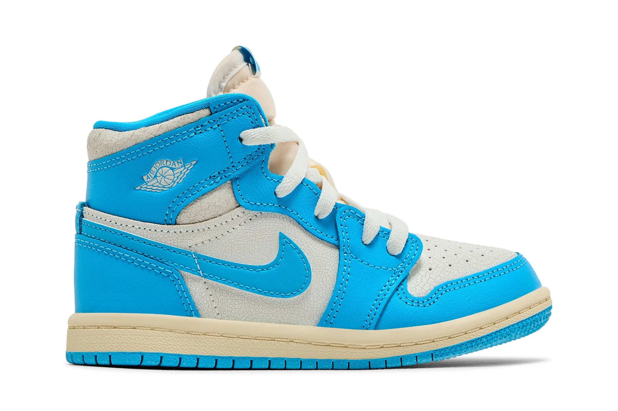The Air Jordan 1 Retro High OG TD 'UNC Reimagined' introduces an upper that combines cracked Sail-colored leather with smooth leather overlays in Dark Powder Blue. The scaled-down design is marked with OG branding elements, including a woven Nike tag atop the tongue and a classic Wings logo on the lateral collar flap. The high-top is mounted on a pre-yellowed midsole, supported underfoot by a faded blue outsole. UPPER MATERIAL Leather