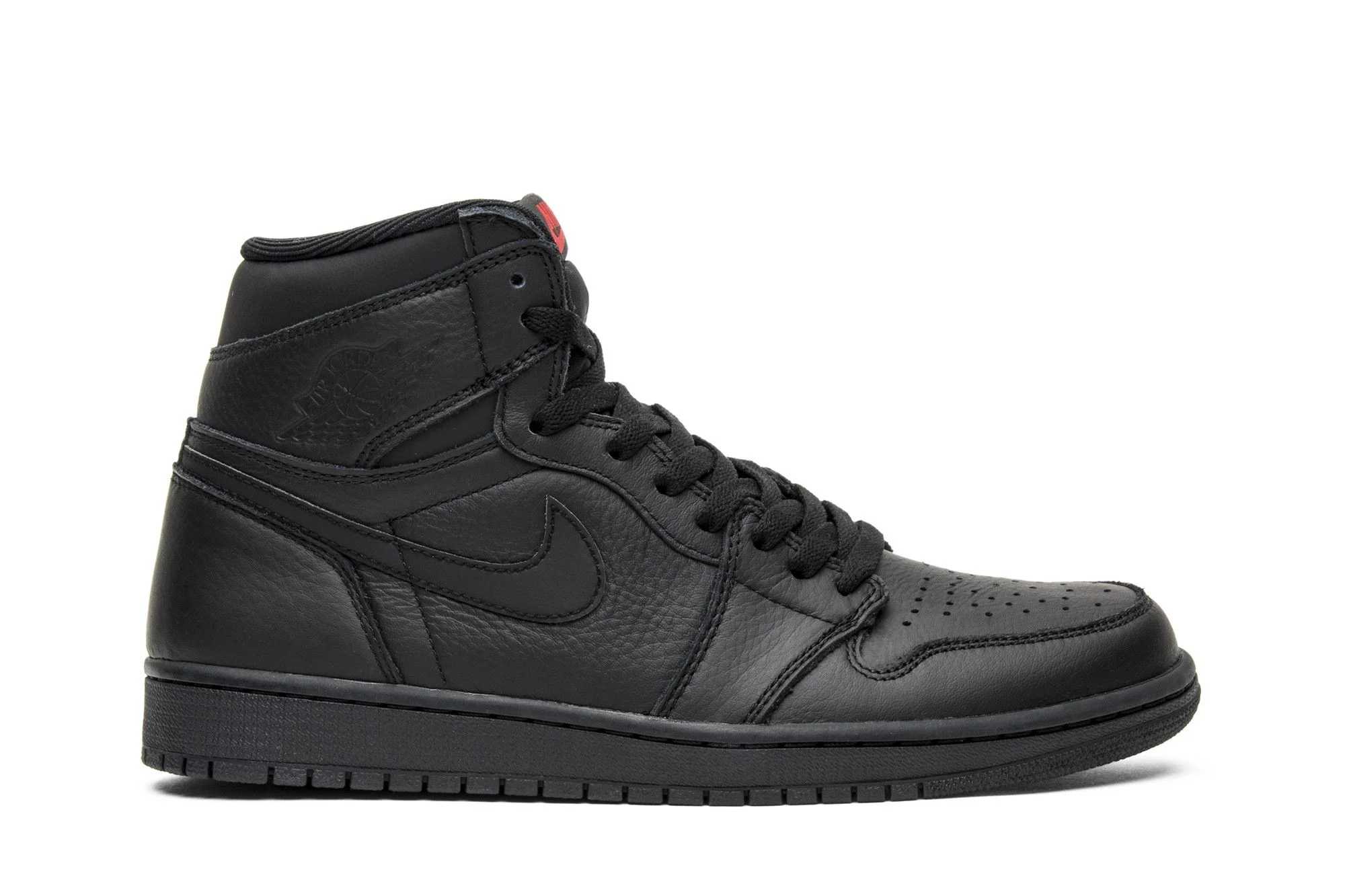 The Nike Air Jordan 1 Retro High OG 'Triple Black' features an all black premium tumbled leather upper with tonal black laces, black sole, and University Red Nike Air branding at the tongue tab. Part of the 'Premium Essentials' pack of June 2017, the 'Triple Black' dropped alongside a 'Sail' colorway. UPPER MATERIAL Leather