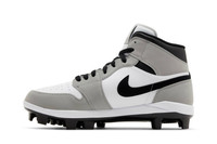 The Jordan 1 Retro MCS ‘Light Smoke Grey’ brings the instantly recognizable design of the original Air Jordan 1 to the baseball diamond. Durable synthetic leather is utilized on the upper, featuring a white base with grey overlays and a black signature Swoosh. Additional branding elements include a Nike Air tongue tag and a Wings logo stamped on the lateral collar flap. The mid-top rides on a lightweight foam midsole, which is underpinned by a cleated TPU outsole. UPPER MATERIAL Leather