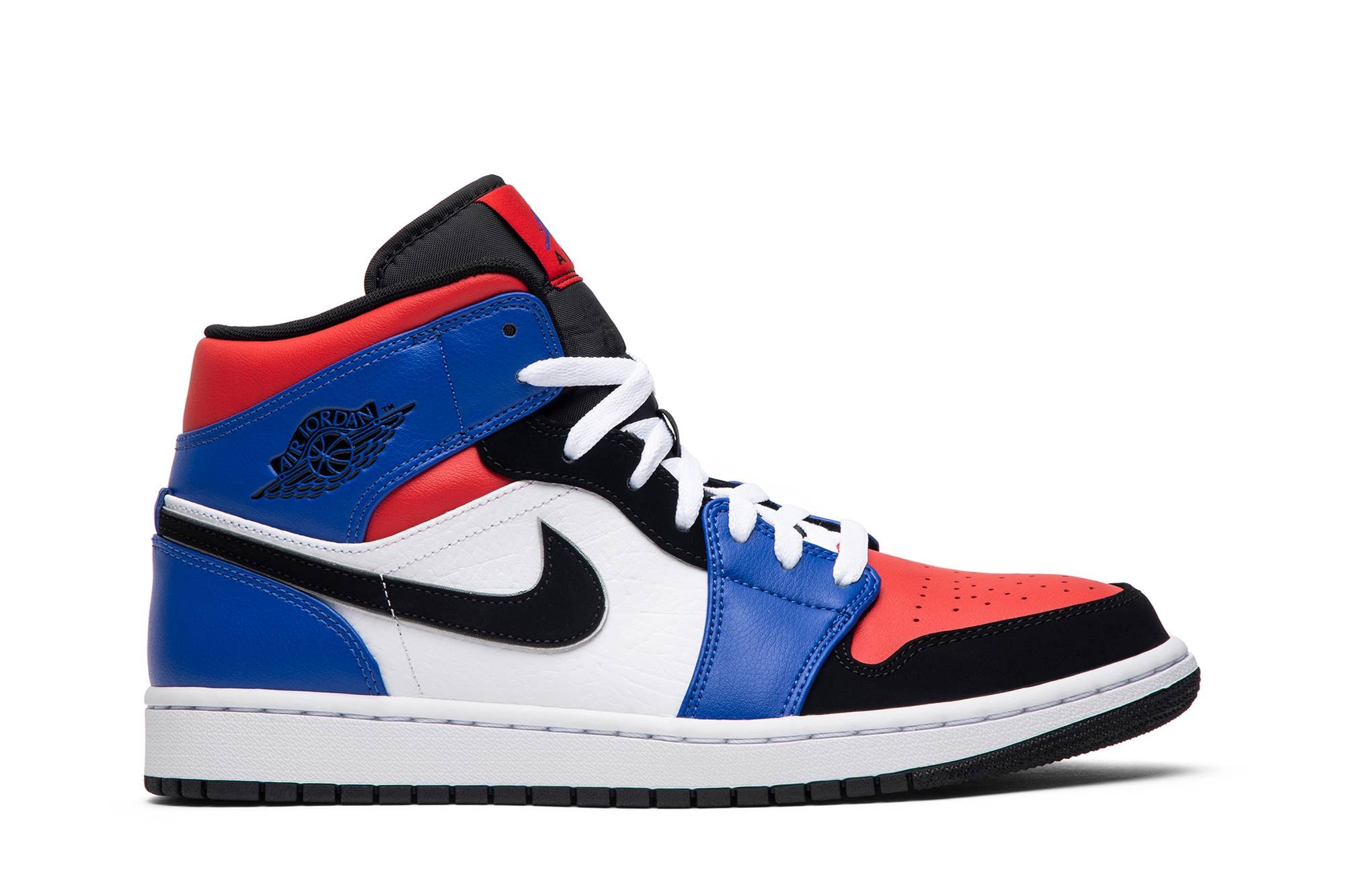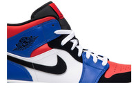 Combining three different colorways from past Air Jordan Retros, the Air Jordan 1 Retro Mid ‘Top 3’ sneaker has a leather upper that boasts several eye-catching colors. The liner, middle eyestays, mudguard and Swoosh feature black nubuck leather, offset by white side panels and laces that contrast with a black tongue. The toe box and collar feature pops of red, complemented by bright blue on the heel and forefoot overlays. A simple white and black sole anchors the look. UPPER MATERIAL Leather