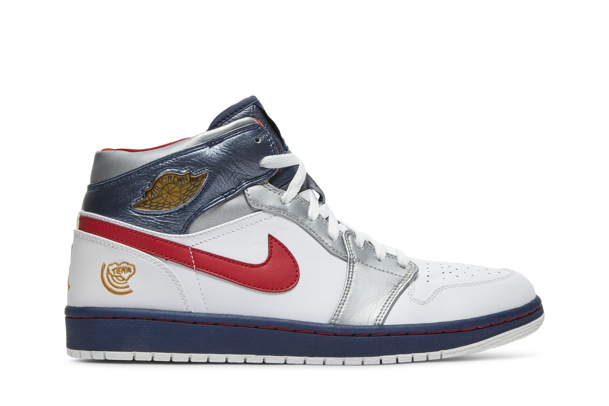 This Air Jordan 1 Retro launched in September 2008, celebrating the gold-medal victory of the US men’s basketball team at that year’s Beijing Olympics. The design borrows the same patriotic color palette used on the Olympic edition of the Air Jordan 7—the shoe that Michael wore as part of the heralded ’92 Dream Team. It features a red, white and blue color scheme accented with celebratory pops of gold and silver on the leather upper. UPPER MATERIAL Leather
