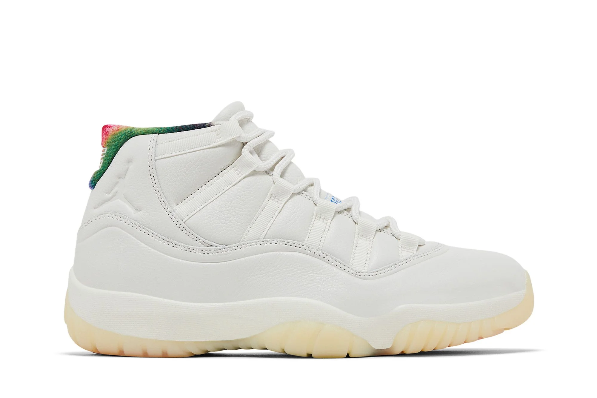 Launching as part of the 'City Pack,' the Air Jordan 11 Retro '285' celebrates the city of Atlanta, with a name referencing the interstate highway that encircles the Georgian capital. Tumbled white leather is utilized on the upper, secured with rope laces that feed through tonal webbing eyelets. A debossed Jumpman adorns the lateral collar, while a stylized '23' graces a textile back tab finished in a blend of green, red and blue. The gradient design continues on the collar lining. Underfoot, the semi-translucent rubber outsole features herringbone traction pods in a contrasting crimson hue. UPPER MATERIAL Patent Leather