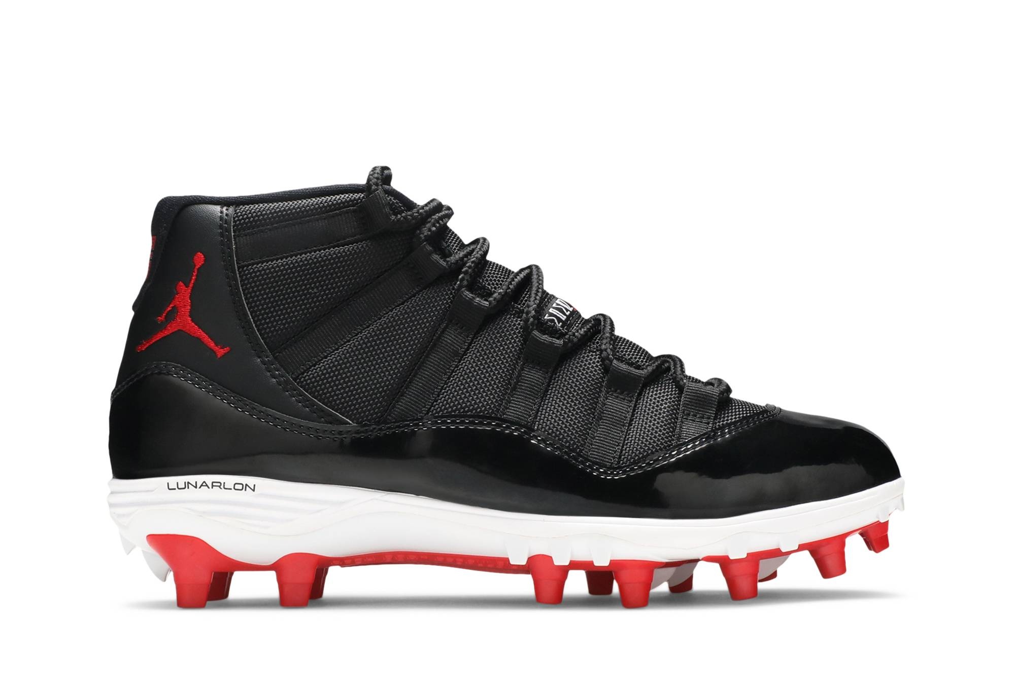 Jordan Brand merges field performance with the essence of their cult classic Jordan 11 in the Jordan Retro 11 Cleat. Appearing in the iconic “Bred” colorway, this mid-top design is geared for the athletes on the gridiron. Featuring black patent leather and mesh upper like its basketball counterpart, the hybrid football silhouette is constructed with a red cleat pattern on the outsole to ensure adequate traction on the turf.