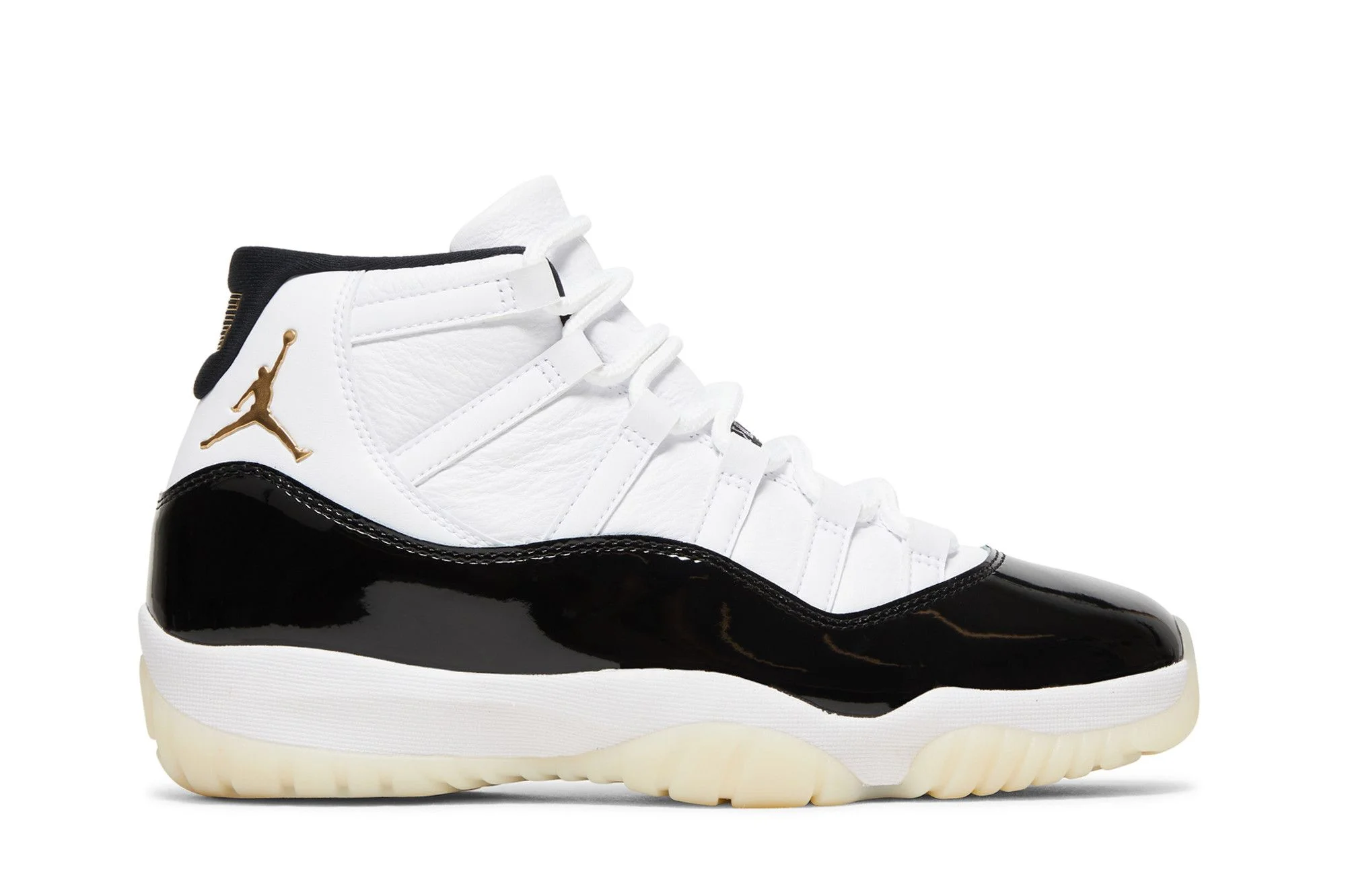 The 2023 edition of the Air Jordan 11 Retro 'Gratitude / Defining Moments', also known as 'DMP', brings back a coveted colorway of the legacy model, originally paired with an Air Jordan 6 as one-half of the 'Defining Moments Pack' from 2006. Inspired by the OG 'Concord' colorway, the championship silhouette features a white tumbled leather upper with tonal webbing eyelets and a black patent leather mudguard. Metallic gold accents land on the shoe's branding elements, including an embossed Jumpman logo on the lateral ankle and a '23' stamped on the heel tab. The sneaker rides on a Phylon midsole, supported by a carbon fiber shank plate and a translucent rubber outsole. UPPER MATERIAL Patent Leather