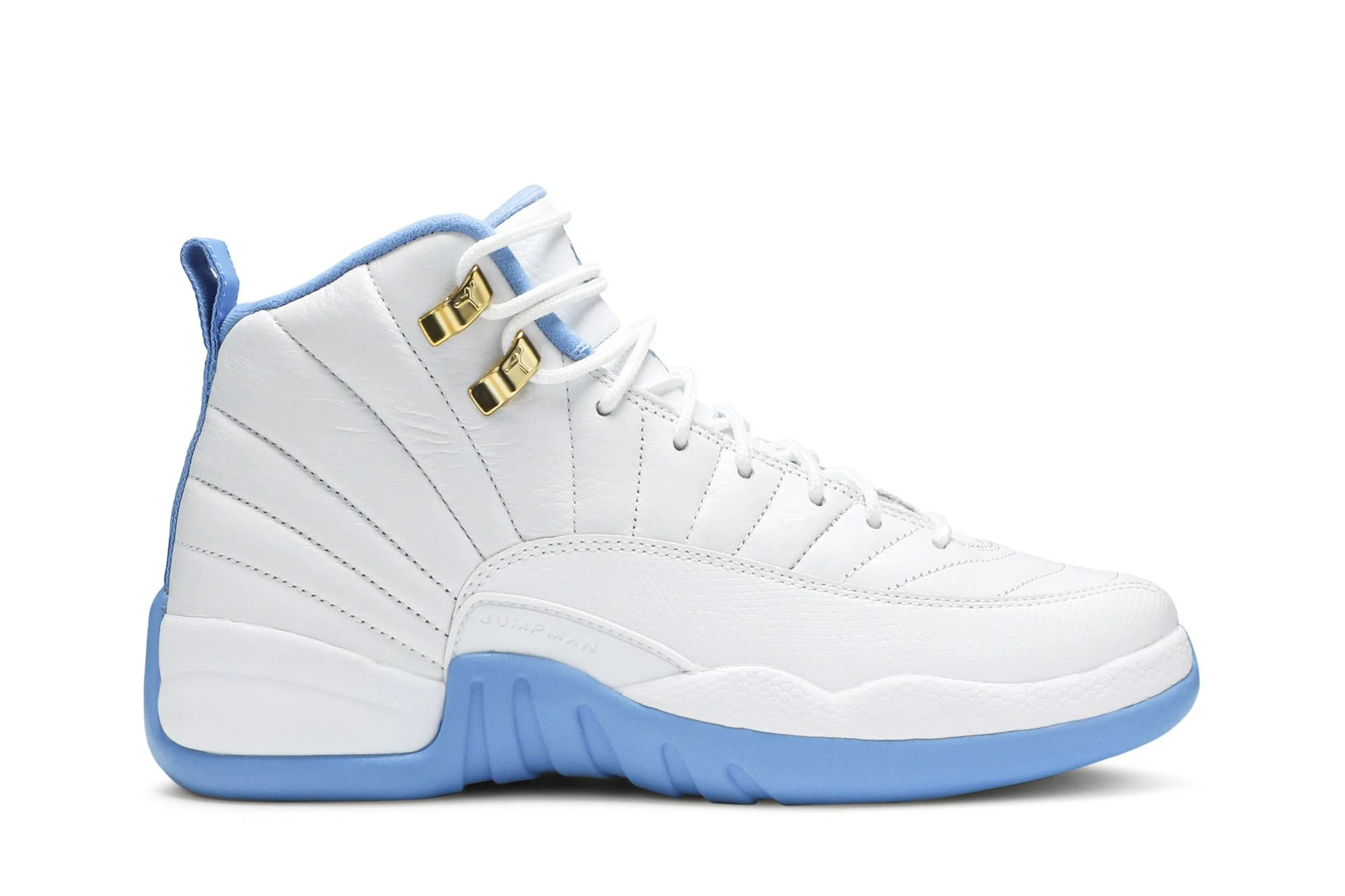 The Air Jordan 12 Retro GG ‘University Blue’ is a grade school only version of the Air Jordan 12 Retro ‘Melo,’ the 2014 colorway worn by Carmelo Anthony during his stint with the Denver Nuggets. The design features a white tumbled leather upper with University Blue accents on the Jumpman, lining, heel tab, and outsole. Released in May of 2016, the sneaker also includes metallic gold eyelets.
