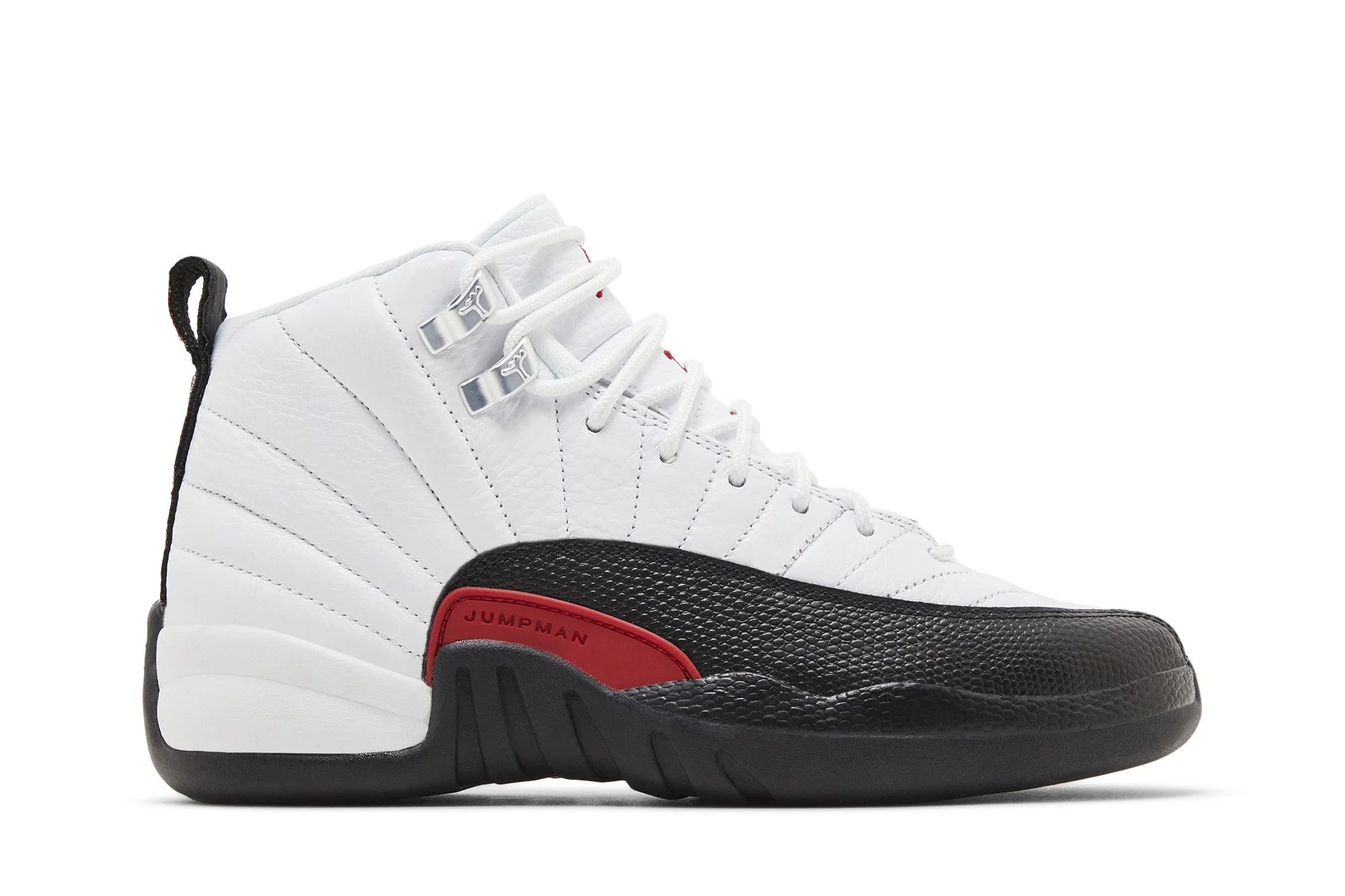 Made for big kids, the Air Jordan 12 Retro GS ‘Taxi Flip’ takes inspiration from a classic OG colorway of the championship silhouette. Radiating stitched lines enliven the upper, crafted from white tumbled leather with a black lizard-textured mudguard. Gym Red accents settle on the midfoot overlay and an embroidered Jumpman logo atop the tongue. A lightweight Phylon midsole with Zoom Air cushioning provides a smooth and responsive ride. UPPER MATERIAL Leather