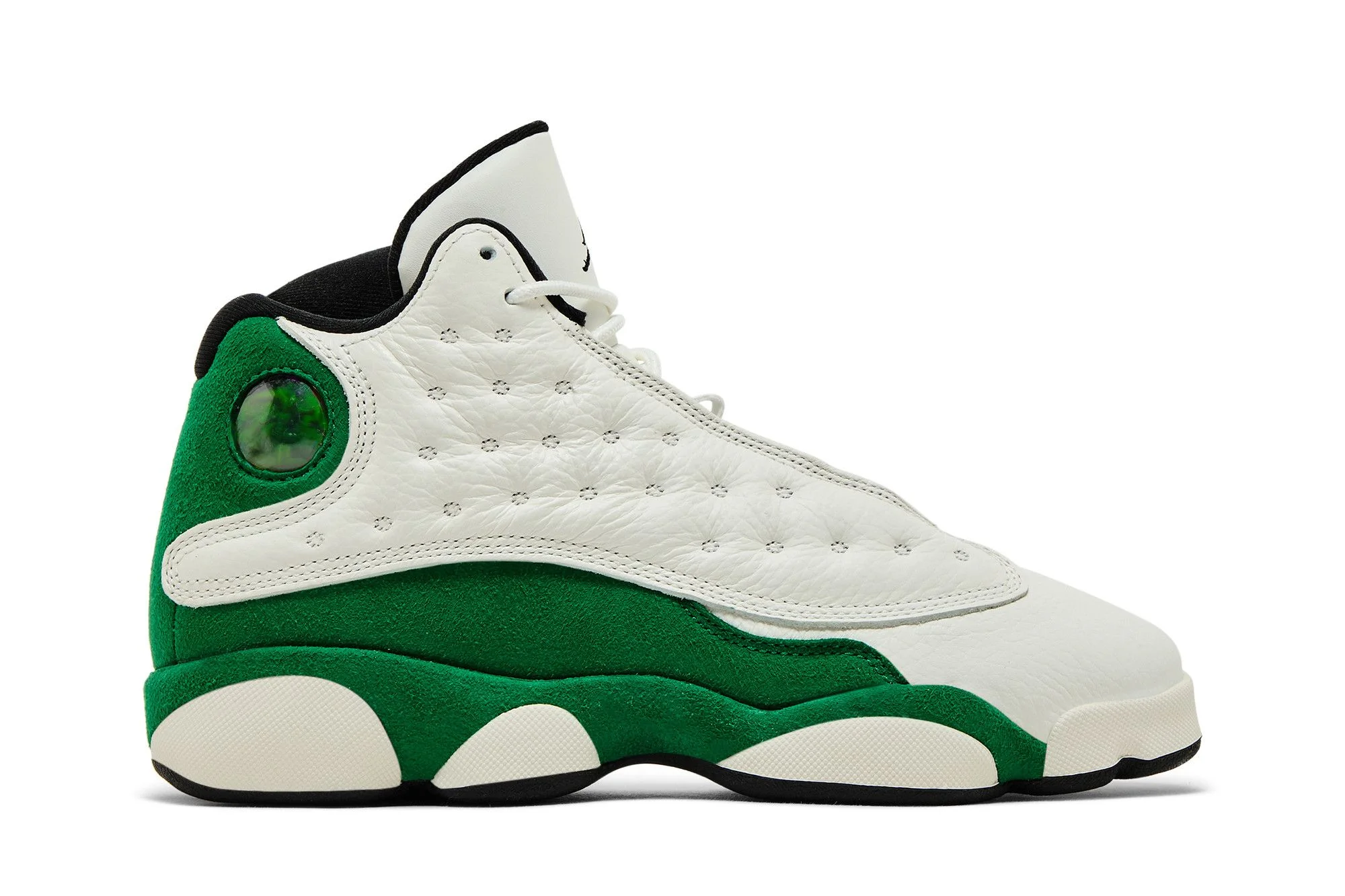 Made for big kids, the Air Jordan 13 Retro GS 'Sail Pine Green' features a white tumbled leather upper with dimpled overlays in matching white leather. A black Jumpman logo is embroidered on the tongue, while the AJ13's signature holographic cat eye decorates the lateral collar. Green synthetic suede wraps around the heel, as well as a lightweight Phylon midsole with Zoom Air cushioning in the forefoot and heel.