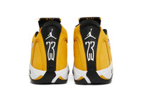 The Air Jordan 14 Retro ‘Ginger’ delivers a twist on the OG Air Jordan 14 Low ‘Ginger’ from 1999. Updated in mid-top form, the upper carries a golden tan nubuck upper with a white leather forefoot overlay. Jumpman logos appear on a Ferrari-inspired badge and rubberized heel overlay, featuring a debossed tire-tread texture and oversized ’23’ branding. Encapsulated Zoom Air cushioning enhances the Phylon midsole, accented with angular teeth-like detailing and supported by a TPU shank plate. UPPER MATERIAL Nubuck