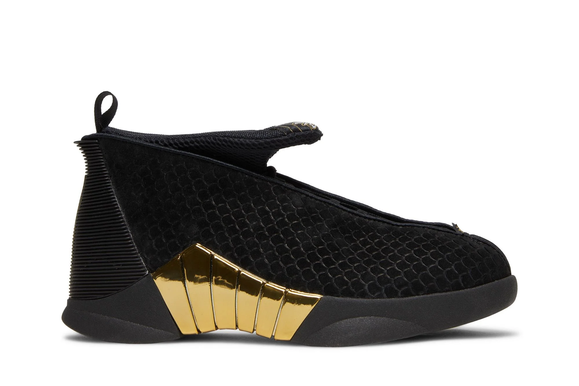 The Air Jordan 15 Retro GS 'Doernbecher' 2018 is the kids'-sized version of a sneaker released in collaboration with Doernbecher Children's Hospital, a partnership that allows patients to design their own Nike gear. Designed by then-11-year-old Donovon Dinneen, the shoe is inspired by his favorite anime show. It features a rich black suede upper with an embossed dragon-scale pattern, plus gold accents that incorporate special details, including Donovon’s birthday and the Japanese symbol for peace. UPPER MATERIAL Suede