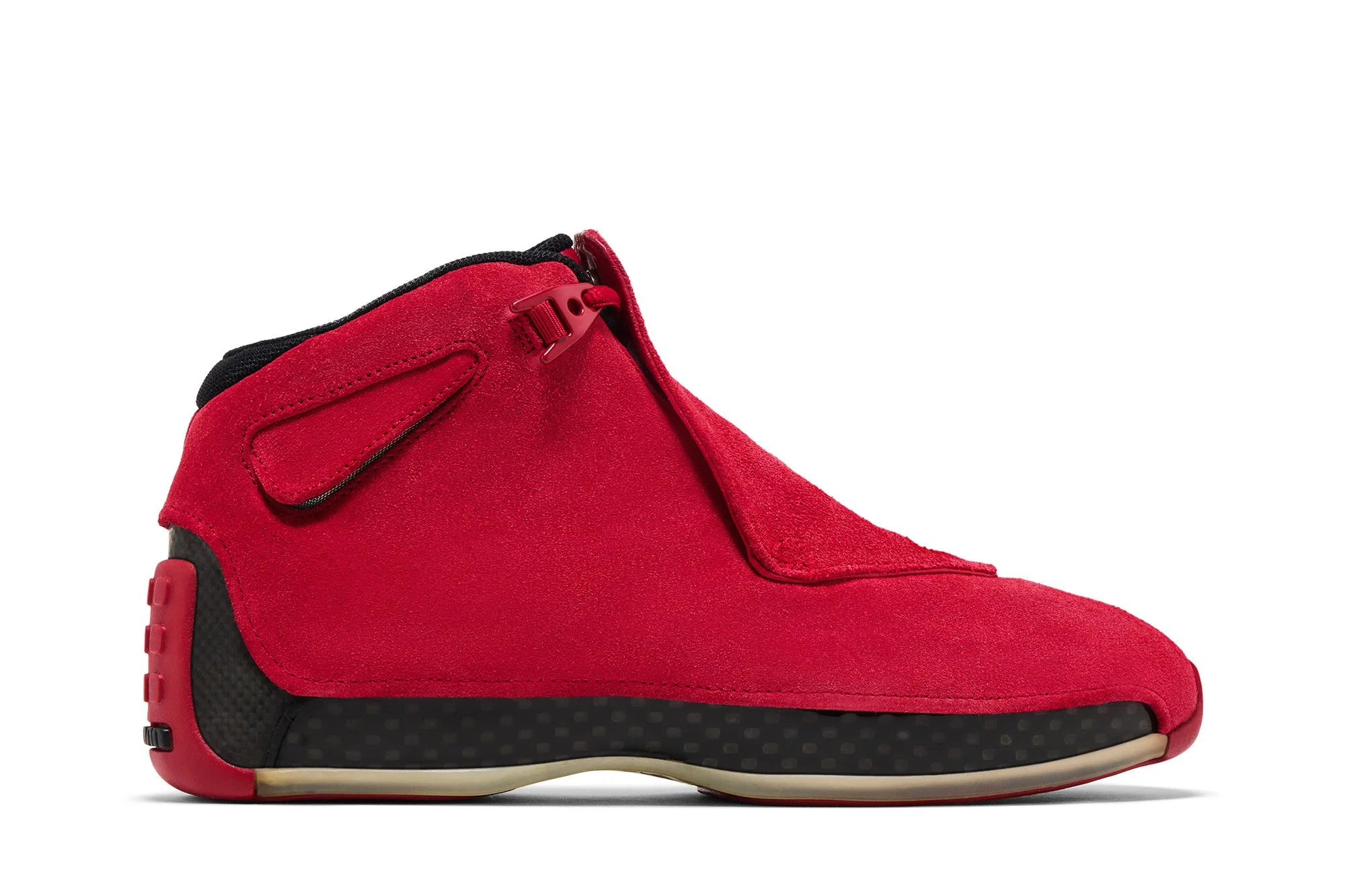 Representing the last shoe that Michael Jordan ever laced up on an NBA court, the Air Jordan 18 returned to stores in April 2018 in this ‘Toro’ colorway. The color palette suggests an alternate reality in which MJ retired in 2003 as a Chicago Bull, featuring a suede upper finished in University Red, contrasted by black accents on the branding elements and lining. Additional hits of black make their way to the midsole and heel wrap. UPPER MATERIAL Suede