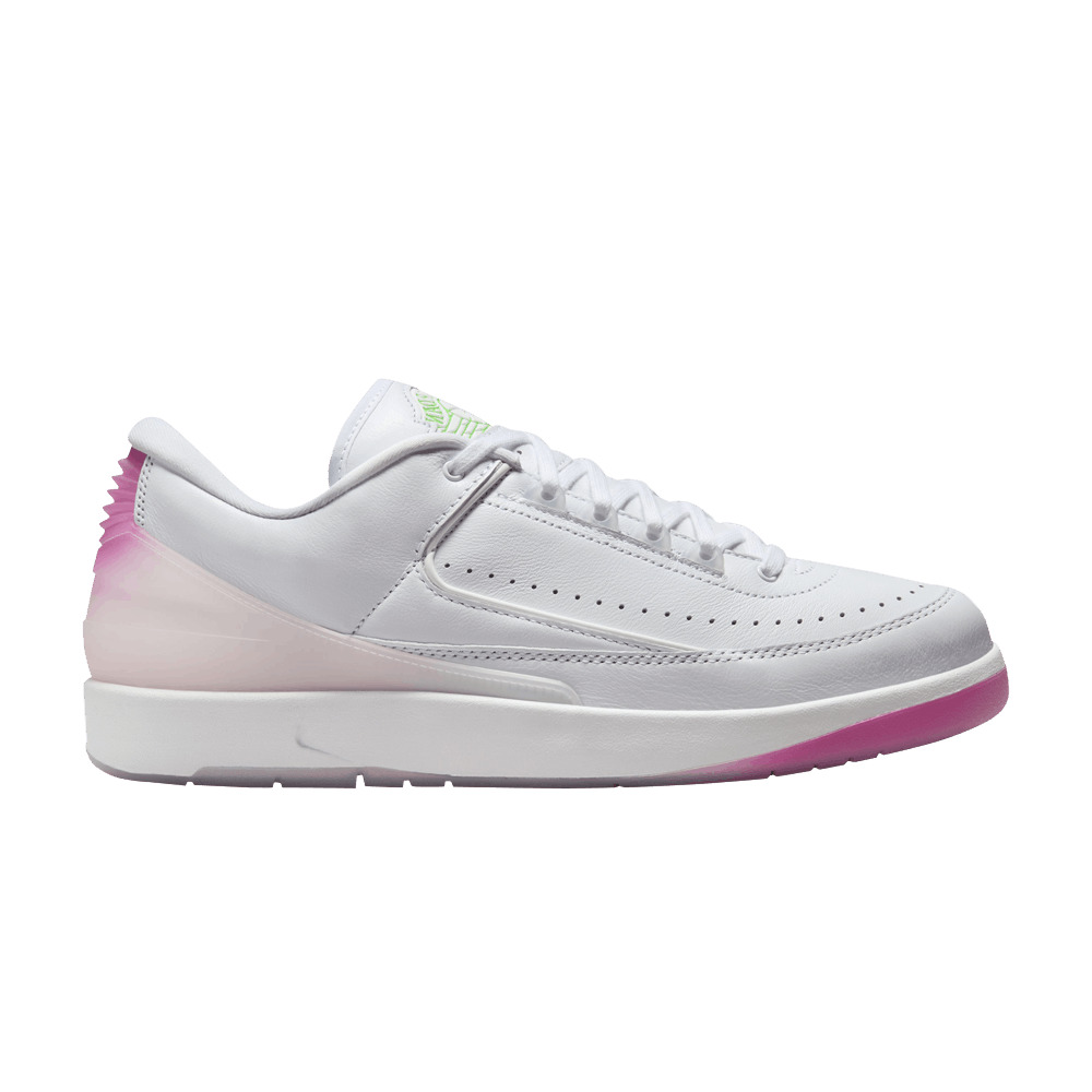 The Air Jordan 2 Retro Low 'Cherry Blossom' presents crisp white leather on the upper, accented with perforated detailing and a pink-tinged TPU back tab. Mismatched branding in a vibrant lime green hue adorns each tongue, featuring the iconic Wings logo on the left shoe and a Jumpman-integrated cherry blossom graphic on the right. The low-top rides on a white polyurethane midsole, fitted with encapsulated Air-sole cushioning and supported by a translucent rubber outsole in a gradient pink finish. UPPER MATERIAL Leather