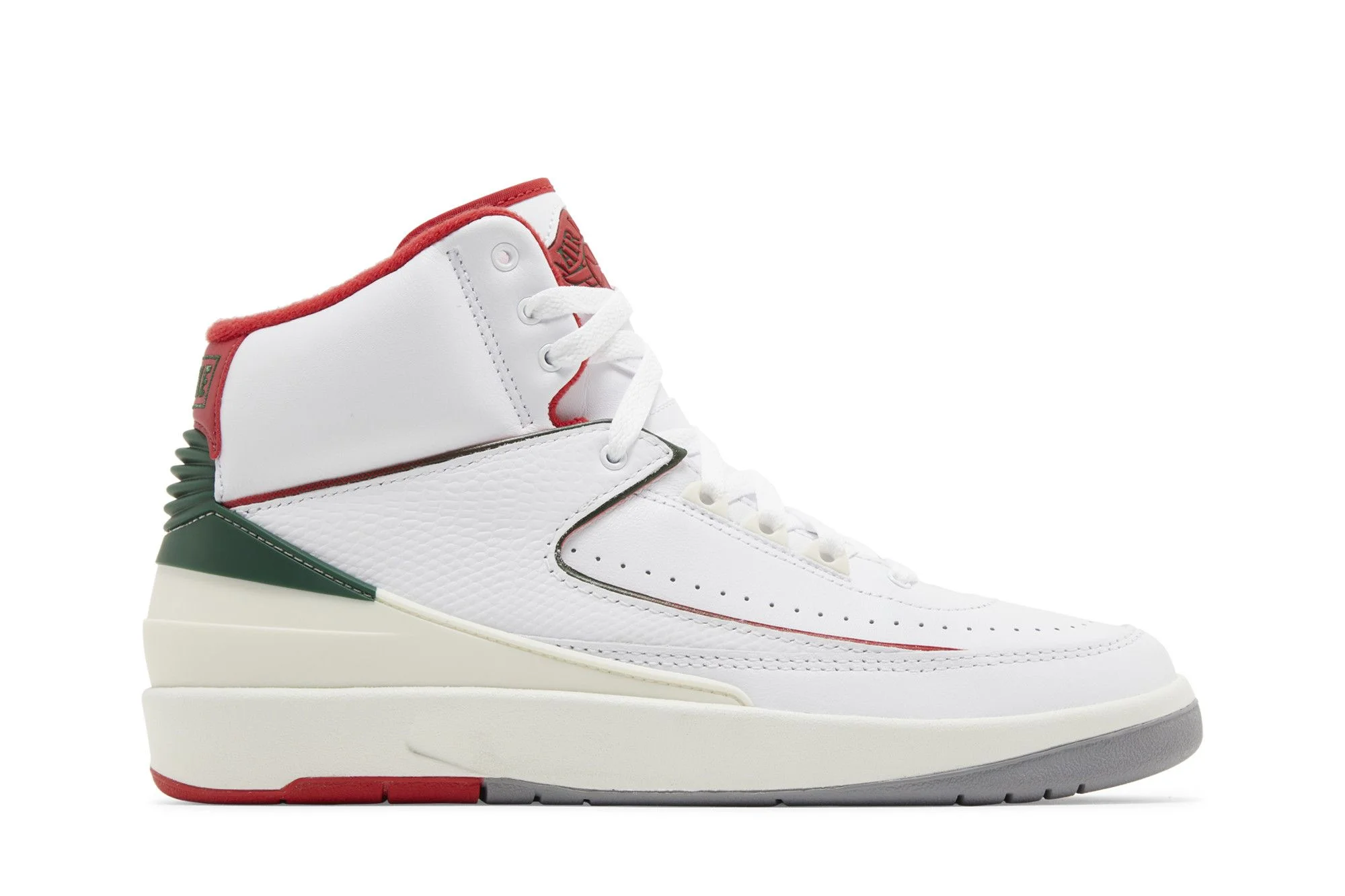 The Air Jordan 2 Retro ‘Origins’ showcases a distinctive color scheme that nods to the shoe’s premium roots. (The original 1986 release paired an elegant Swooshless design with made-in-Italy construction.) This pair dons a white leather upper with faux lizard skin on the midfoot overlay. The latter is outlined in two-tone piping in red and green, with the contrasting hues making a repeat appearance on the Nike-branded heel tab. Crimson textile lines the high-cut collar, matching the embossed Wings logo that decorates the tongue. A vintage off-white finish is applied to the polyurethane midsole, fitted with encapsulated Air-sole cushioning and supported by a two-tone rubber outsole. UPPER MATERIAL Leather