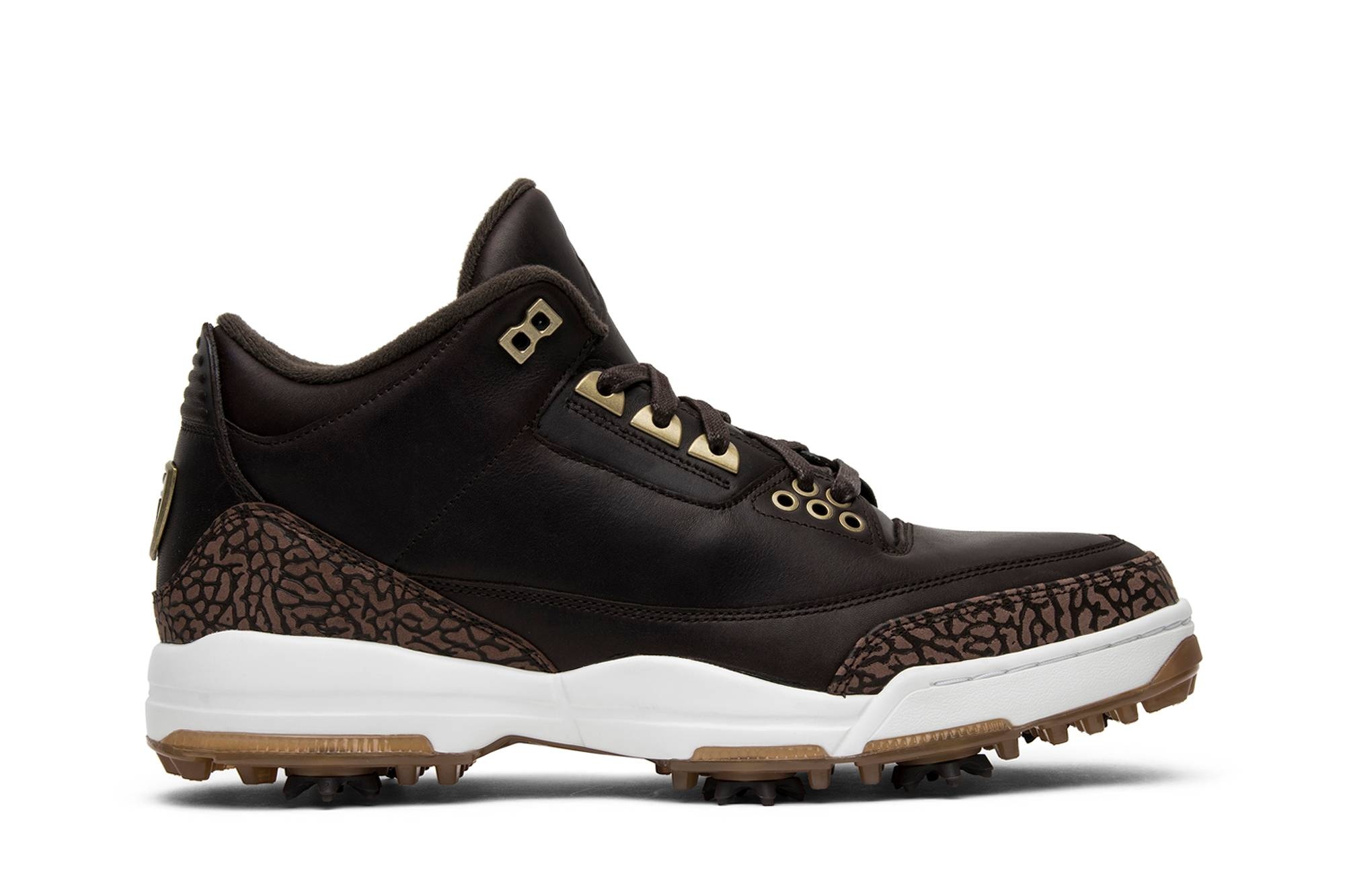 As a wild update to the classic Air Jordan 3, the Air Jordan 3 Golf Premium 'Brown' features a fun brown elephant print across the toe box and heel, effectively accenting a premium brown leather upper. The sneaker also features a full-length Lunarlon white midsole for added stability, and bronze metal detailing on the eyestay and eyelets. Keep an eye out for the Nike Golf shield logo on the back heel.
