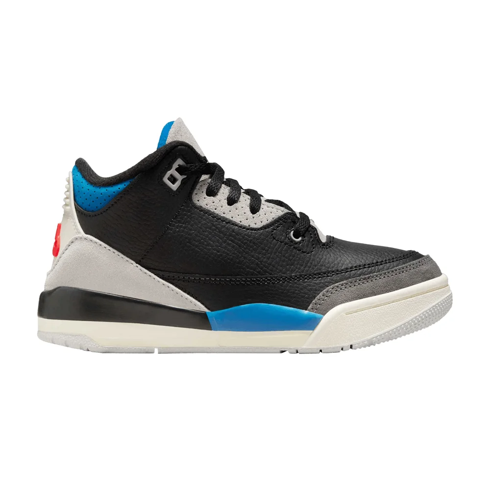 Scaled down for little kids, the Air Jordan 3 Retro OG PS 'Rare Air' is built with black tumbled leather, featuring suede overlays in charcoal and light grey at the forefoot and heel, respectively. Military Blue accents land on the midsole, collar, and interior tongue, featuring a crimson Jumpman on the opposite side. Nike Air branding in a matching red hue appears on the heel tab, with the right shoe displaying a flipped logo to make it look like a factory defect. UPPER MATERIAL Leather