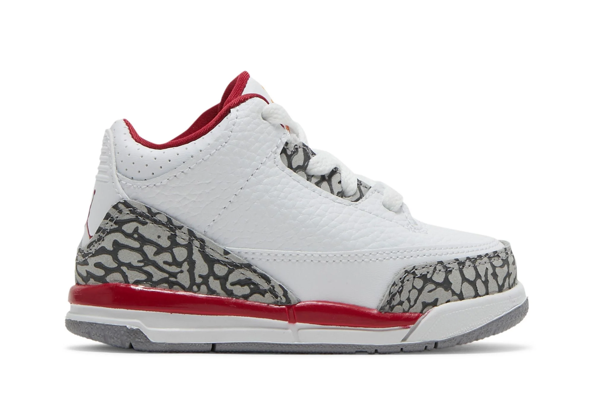 The Air Jordan 3 Retro TD ‘Cardinal Red’ delivers a scaled-down version of the classic silhouette, featuring a white tumbled leather upper with a familiar accent color borrowed from the Air Jordan 7. The rich crimson hue appears on the collar lining, cushioned foam midsole, and Jumpman heel logo. Grey elephant overlays maintain the sneaker’s OG-inspired aesthetic. Atop the tongue, an orange embroidered Jumpman provides a contrasting pop of color. UPPER MATERIAL Leather