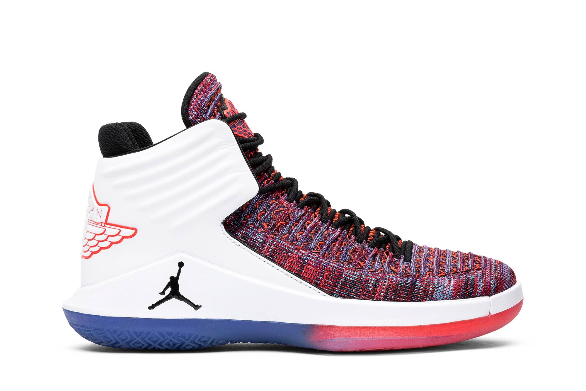 The Air Jordan 32 takes a bow with this ‘Finale’ colorway from July 2018, featuring a Flyknit upper crafted from a combination of blue, red and purple yarns. The intricate multicolor finish is balanced by black laces directly integrated into the knit structure, along with a crisp white heel counter that blends into the midsole. Finally, the mid-top is adorned with unique badging in the form of a large Jordan ‘Wings’ logo on the heel and ‘Finale’ woven label on the interior of the tongue.