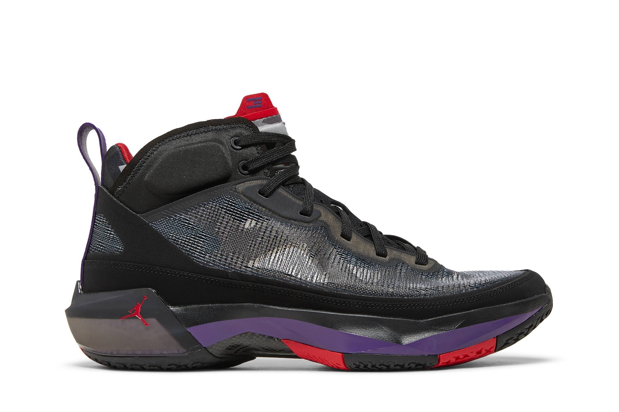 The Air Jordan 37 ‘Raptors’ spotlights a familiar color scheme inspired by an OG colorway of the Air Jordan 7. Layers of black Leno-weave are utilized on the upper, bolstered with a tonal nubuck mudguard and accented with a violet pull tab at the heel. A crimson Jumpman adorns the tongue, featuring a jagged greyscale pattern borrowed from the AJ7. The midsole packs double-stacked Air units in the forefoot and cushy Formula 23 foam in the heel. Underfoot, a carbon fiber plate adds torsional stability to a multicolor rubber outsole in black, gold, True Red and Court Purple. UPPER MATERIAL Leno-Weave