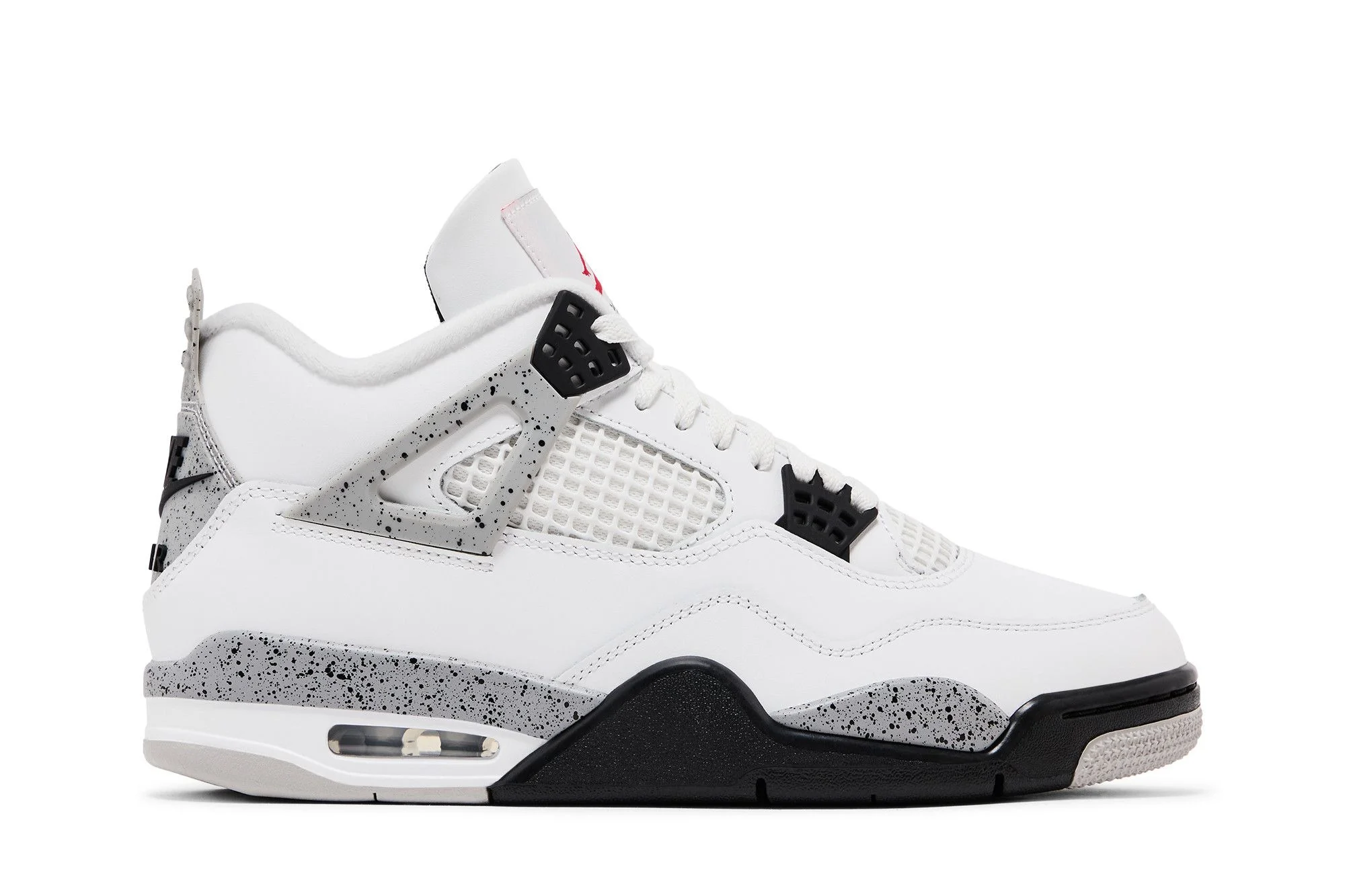 The 2025 edition of the Air Jordan 4 Retro OG 'White Cement' utilizes a layered white leather upper equipped with quarter panel netting and black molded eyelets. Tech Grey accents, covered in black speckled detailing, land on the TPU support wings, Air-assisted polyurethane midsole, and heel tab, the latter marked with Nike Air branding. A vibrant flash of color arrives via a crimson Jumpman logo on the Flight tongue tag. Underfoot, the rubber outsole features flex grooves and a herringbone traction pattern. UPPER MATERIAL Leather