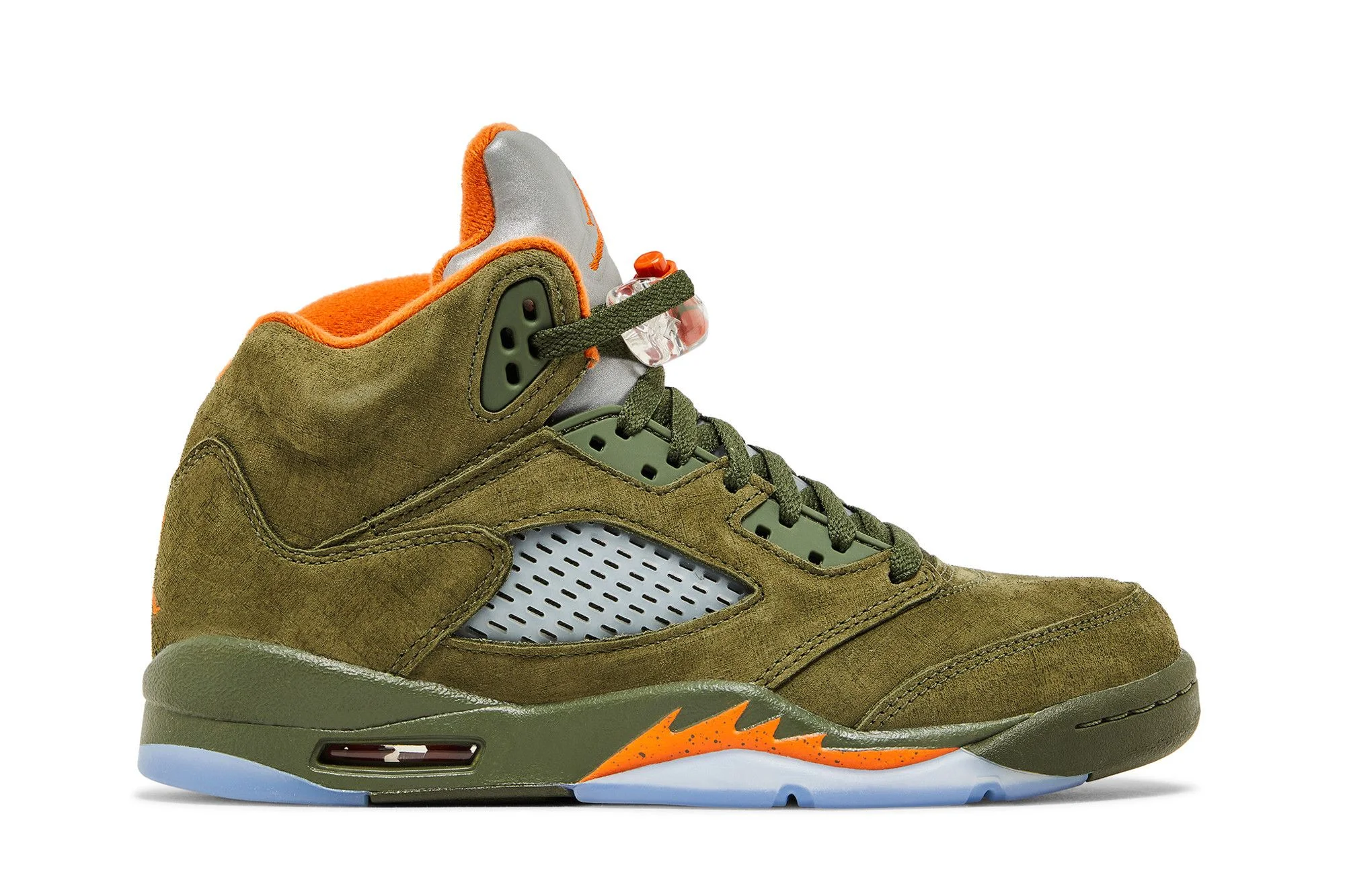 Made for big kids, the 2024 reissue of the Air Jordan 5 Retro GS ‘Olive’ revives a Lifestyle Series colorway from Jordan Brand’s 2006 archive. The olive suede upper features hallmark details of the AJ5, including lace locks, quarter panel netting and a silver reflective tongue. The latter is marked with an orange Jumpman logo, matching the interior lining and a second Jumpman icon embroidered on the back heel. Lightweight cushioning arrives via an Air-assisted polyurethane midsole, finished in an olive drab hue with orange shark tooth detailing. A translucent rubber outsole provides grippy traction underfoot. UPPER MATERIAL Suede