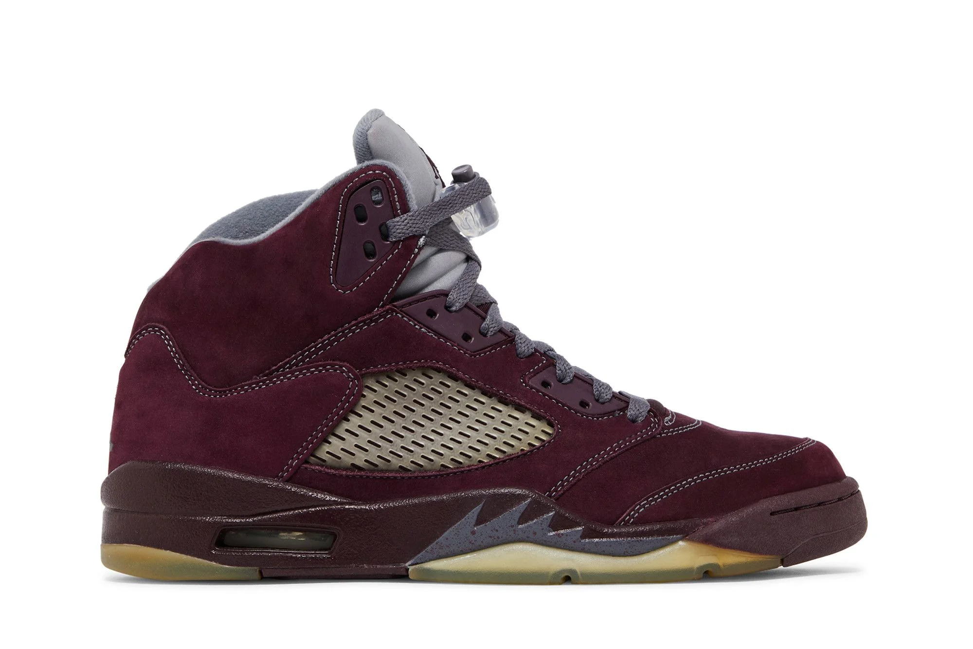 The Air Jordan 5 Retro LS ‘Burgundy’ 2006 sees the classic silhouette taking on an untraditional look, highlighted by a full suede upper with contrast stitching. The shoe’s rich burgundy coloring is complemented by grey laces and a reflective silver coating on the lightly padded tongue. Metallic silver on the silhouette’s signature ‘shark teeth’ detailing stands out against the burgundy midsole. UPPER MATERIAL Suede