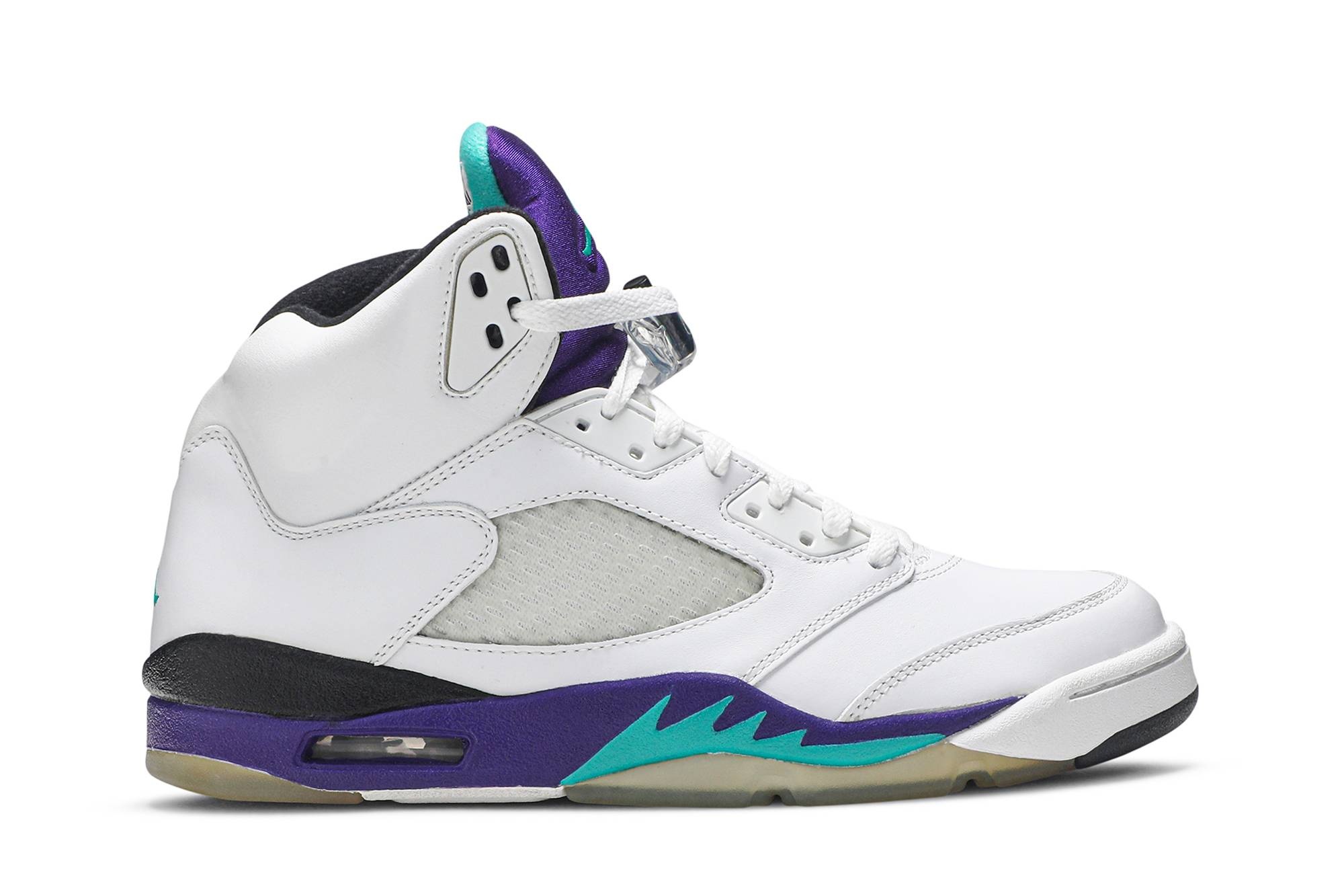 The ‘Grape’ edition of the Air Jordan 5 was one of the original four colorways released in 1990. The iconic look made a celebrated, albeit more limited, comeback in 2006. The predominantly white upper is sharply contrasted by a retro pairing of teal and purple atop an icy blue translucent outsole. The NIKE AIR on the heel has been swapped with a Jumpman logo.