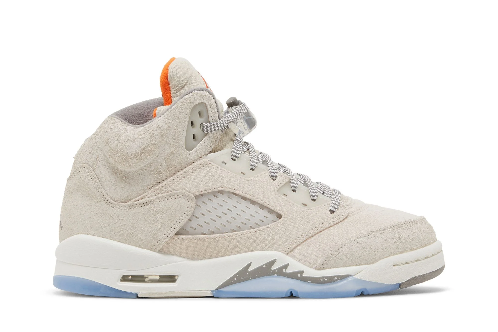 Built for big kids, the Air Jordan 5 Retro SE Craft GS ‘Light Orewood Brown’ utilizes a chalk-hued suede and textile upper with two-tone laces that feed through semi-translucent eyelets. A padded mid-cut collar provides a comfortable fit, while quarter-panel netting offers improved breathability. Orange textile lines the tongue, marked with a Jumpman logo in a matching citrus hue. Additional Jumpman branding embellishes the heel overlay in grey embroidery. The legacy silhouette rests on an off-white polyurethane midsole, accented with speckled shark-tooth detailing and supported by a translucent rubber outsole. UPPER MATERIAL Suede