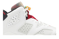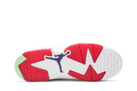 Made for big kids, the Air Jordan 6 Retro GS ‘Hare’ borrows the OG color scheme from the Hare Jordan 7, released in 1992 to coincide with the iconic TV ad starring MJ and Bugs Bunny. The upper combines a perforated grey leather base with white leather overlays and contrasting pops of True Red on the tongue and midsole. A purple Jumpman adorns the heel, while orange and green lace locks give the nod to MJ’s carrot-chomping sidekick.