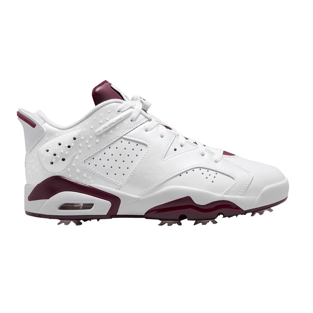 The Air Jordan 6 Retro Low Golf NRG ‘Bordeaux’ takes the championship silhouette from the hardwood to the fairway. The low-top makes use of a white water-resistant leather upper, featuring perforated underlays and faux water beads throughout the collar and heel. Contrasting burgundy accents appear on the Jumpman-branded tongue and spoiler-like back tab, the latter positioned above a unique wine-glass graphic in tonal embroidery. The sneaker rests on a two-tone foam midsole with visible Air-sole cushioning in the heel. Underfoot, a translucent outsole is equipped with seven removable golf spikes for superior traction and ground feel. UPPER MATERIAL Leather