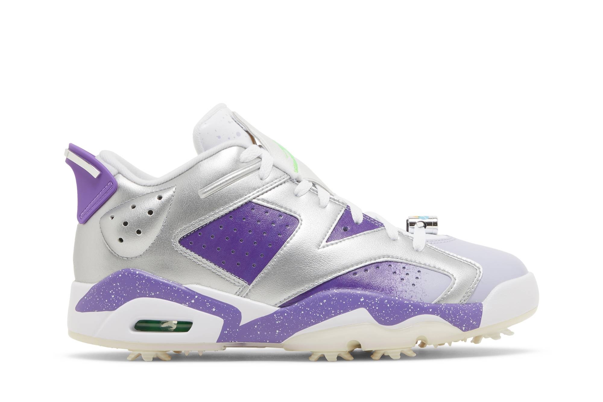 The Air Jordan 6 Retro Low Golf NRG ‘US Open’ delivers a fairway-ready version of Michael Jordan’s first championship silhouette. Paying homage to Los Angeles, host city of the 2023 US Open, the low-top is updated with a waterproof synthetic leather upper, featuring metallic silver overlays with a two-tone base in Action Grape and Oxygen Purple. A tonal Jumpman logo graces the back heel, while a second Jumpman in bright green embroidery adorns the tongue. Lightweight cushioning arrives via a speckled foam midsole, fitted with a green-tinged Air-sole unit in the heel. Underfoot, the translucent outsole features strategically placed spikes and ‘Jordan Golf’ branding. UPPER MATERIAL Leather