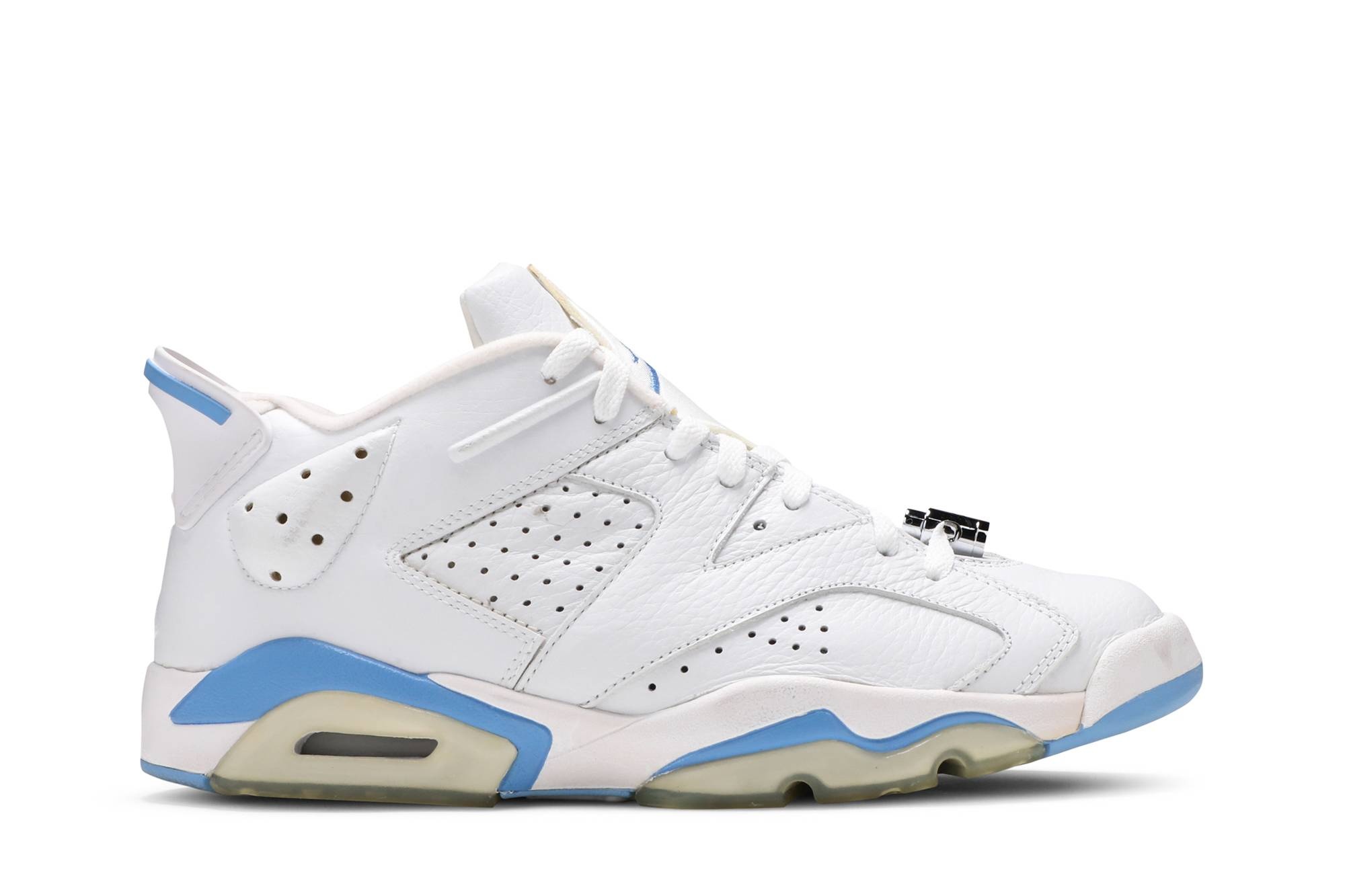 Reimagined with a low-top construction, the Air Jordan 6 Retro Low features perforated paneling throughout the upper. Appearing with University Blue accents, the external heel counter remains intact, while the chrome lace lock promotes a more secure fit. Underfoot, the shoe maintains the Jordan 6’s original tooling. UPPER MATERIAL Suede