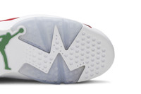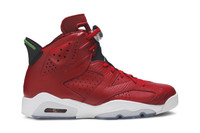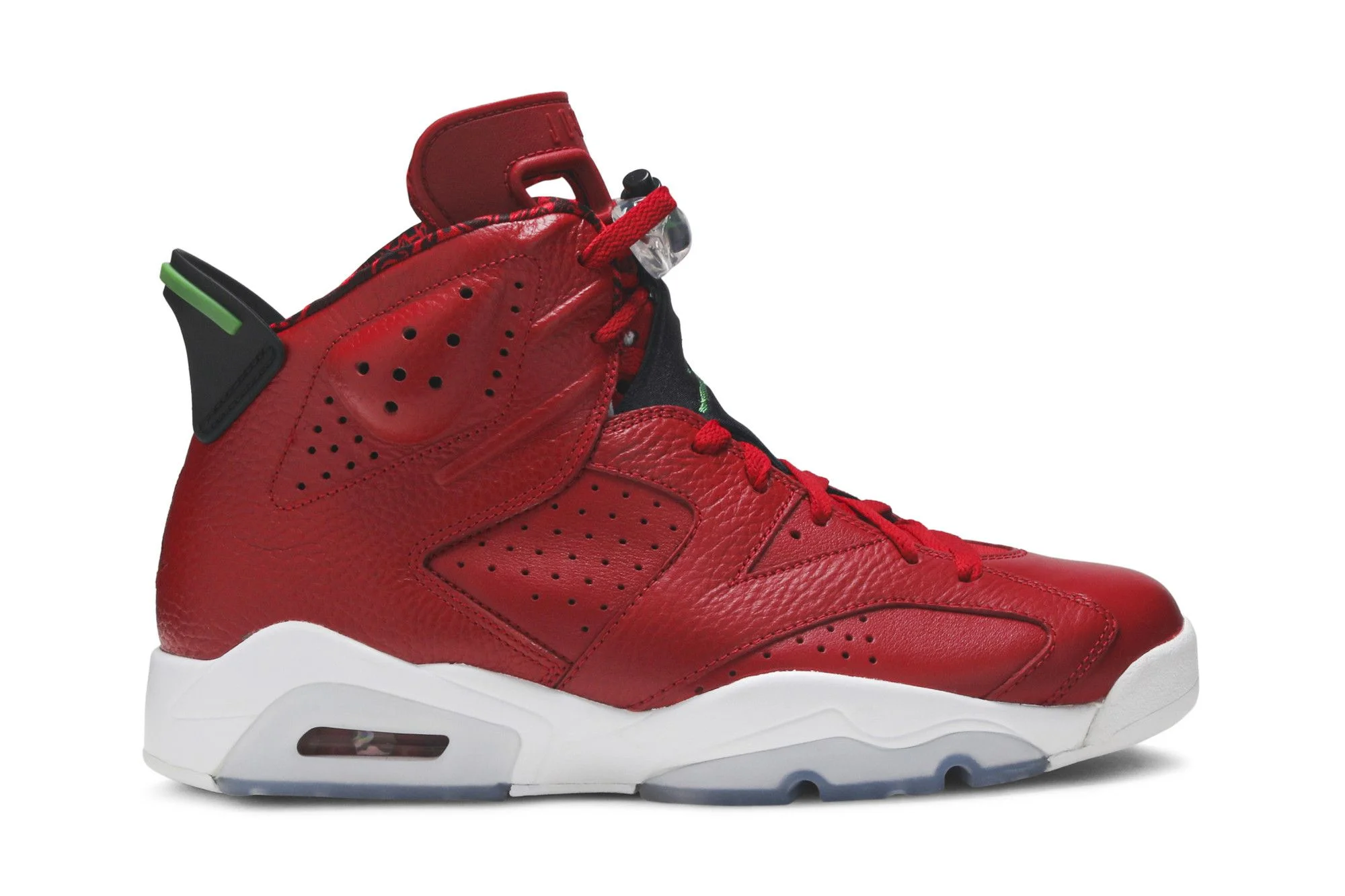 The Nike Air Jordan 6 Spizike 'History of Jordan' features a varsity red tumbled leather upper with green and black accents, a white midsole, and an icy blue translucent outsole. Released in August of 2014, the colorway gained its nickname by sharing a release date with the OG Jordan Spiz'ike, a hybrid of the Jordan 3, 4, 5, 6 and 20 silhouettes. UPPER MATERIAL Leather