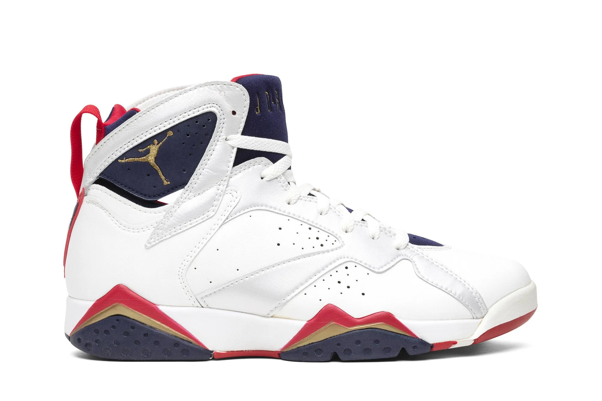 To celebrate Michael Jordan’s participation in the 1992 Summer Olympics in Barcelona, this colorway celebrates with patriotic red, white and blue tones. The Air Jordan 7 OG 'Olympic' 1992 features a white leather upper with perforations for breathability, grey leather overlays along the eyestays, sidewall and collar, and Midnight Navy accents on the branded tongue and collar. Unlike other Air Jordans, this colorway features the number 9 MJ wore during the Summer Olympics on the heel instead of the number 23. UPPER MATERIAL Leather