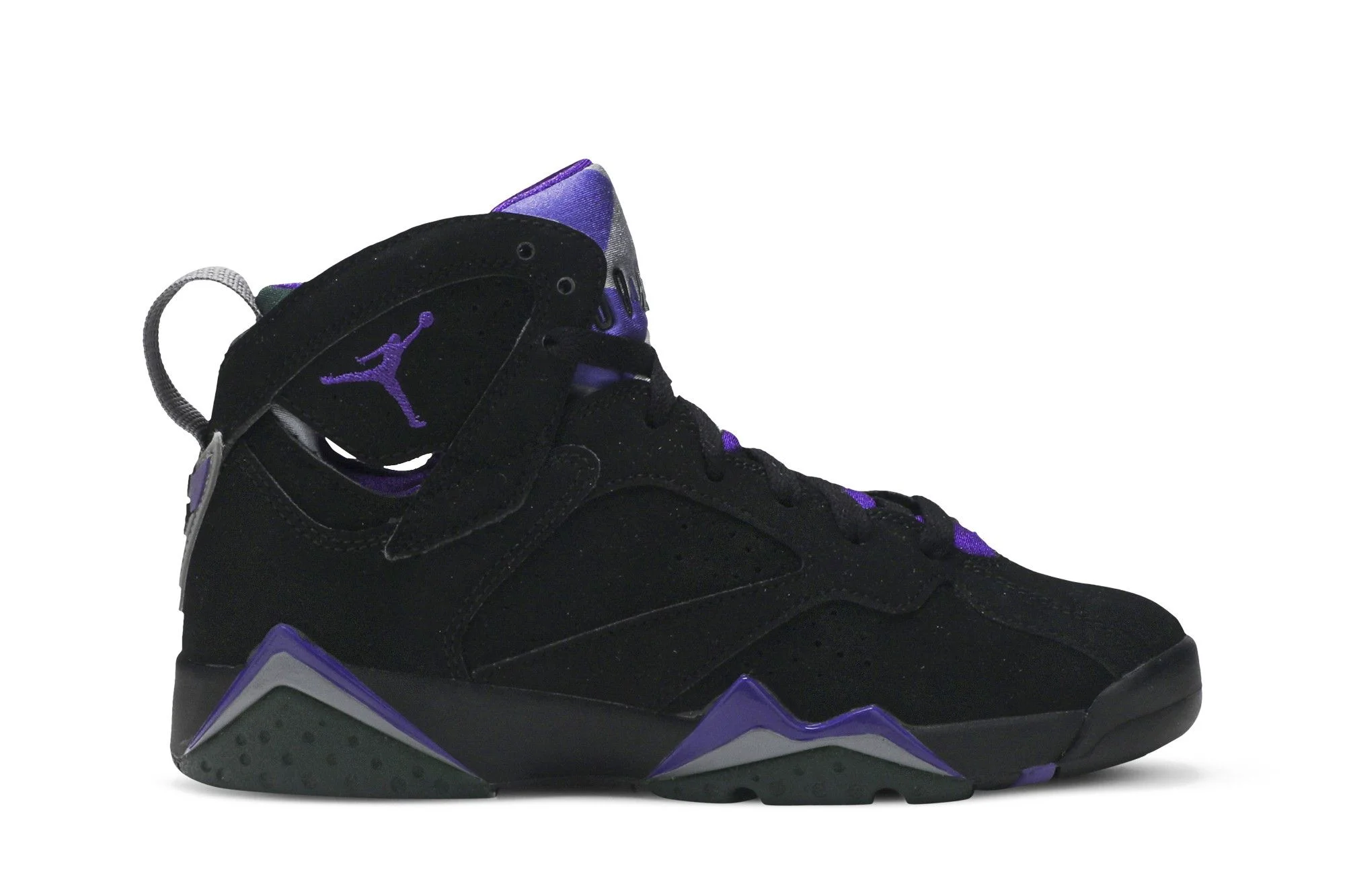 The Air Jordan 7 Retro GS 'Ray Allen' commemorates the Hall of Fame career of a sharpshooting guard and his time with the Milwaukee Bucks. In June 2019, 23 years after Allen was drafted, the shoe was released with a black, Fierce Purple and Dark Steel Grey colorway that represents the Bucks' road uniforms. It features a black nubuck upper, grey and purple accents on the midsole, and purple Jumpman branding on the ankle. A dark green outsole, a nod to the Milwaukee's home uniforms, completes the style. UPPER MATERIAL Nubuck