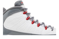 Made for a new generation of Michael Jordan fans, the Air Jordan 9 Retro GS ‘Fire Red’ brings glossy detailing to the shoe that originally debuted during MJ’s first retirement from basketball. The upper combines white stitched leather with contrasting patent leather overlays in Cool Grey. Fire Red accents settle on the molded eyelets, ‘Air Jordan’ tongue tags, and webbing pull tabs. Lightweight cushioning comes courtesy of a grey polyurethane midsole with an encapsulated Air-sole unit in the heel. Underfoot, the white rubber outsole features graphics and multilingual phrases that reference His Airness’ emergence as an international icon. UPPER MATERIAL Patent Leather