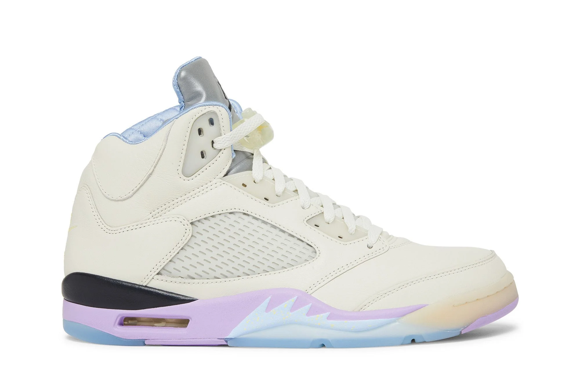 Launching as part of the ‘We the Best’ capsule collection, the DJ Khaled x Air Jordan 5 Retro ‘Sail’ makes use of an off-white leather upper with pastel color-popped accents. They include a powder blue quilted lining and an Air-assisted polyurethane midsole in Violet Star. A traditional Jumpman icon adorns the tongue, featuring a reflective silver finish on the exterior side and ‘Keep Going’ inscribed on the interior. Mismatched heel overlays display a Nike Air logo and ‘We the Best’ branding. The latter phrase makes a repeat appearance on the translucent rubber outsole of the right shoe. UPPER MATERIAL Leather