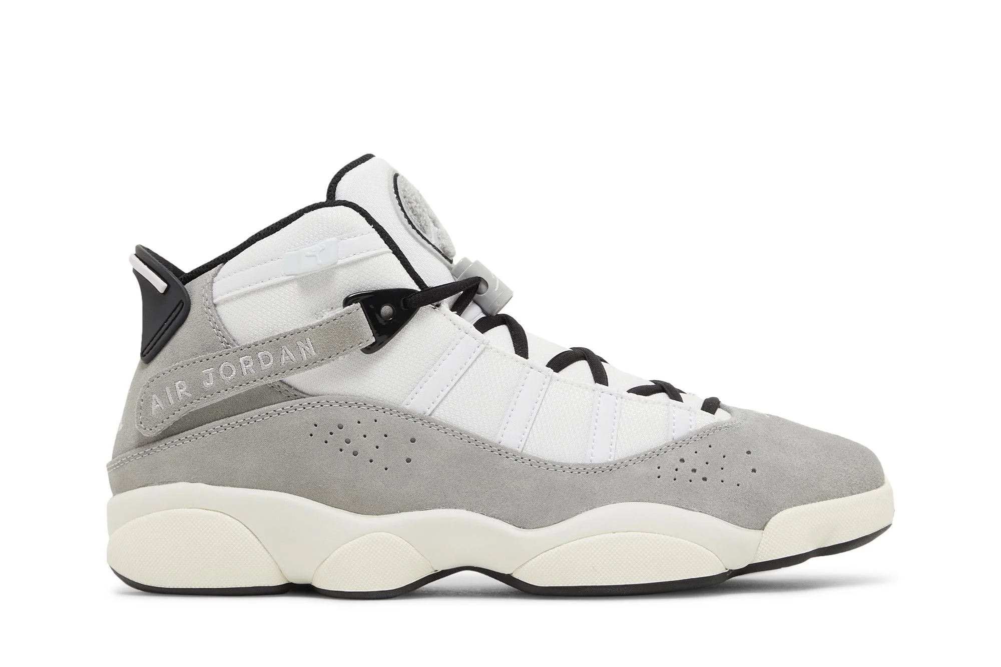 The Jordan 6 Rings ‘Light Smoke Grey’ brings a neutral palette to the lifestyle silhouette inspired by Michael Jordan’s six championship silhouettes. Ventilated white mesh is utilized on the upper, secured with a hidden lacing system and fortified with suede overlays in a light grey finish. A chenille Jumpman patch adorns the tongue, while a second Jumpman logo graces the back heel. Additional heritage details include an adjustable ankle strap, lace locks, and a molded pull tab at the heel. A vintage off-white finish is applied to the midsole, supported underfoot by herringbone rubber traction pods. UPPER MATERIAL Suede