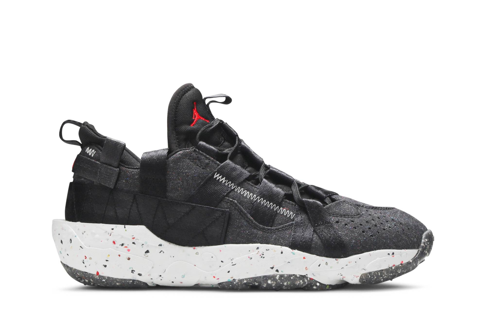 The Jordan Crater ‘Black University Red’ highlights an essential color scheme on a sustainable build, featuring at least 20% recycled materials. The black textile upper, constructed from 100% recycled polyester, features a stripped-down design so as to keep adhesives to a minimum. Asymmetrical laces provide an optimal fit, while webbing pull tabs at the tongue and heel deliver easy on and off. The sneaker’s Crater Foam midsole blends standard Nike foams with 12 percent Nike Grind rubber. UPPER MATERIAL Textile