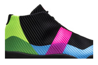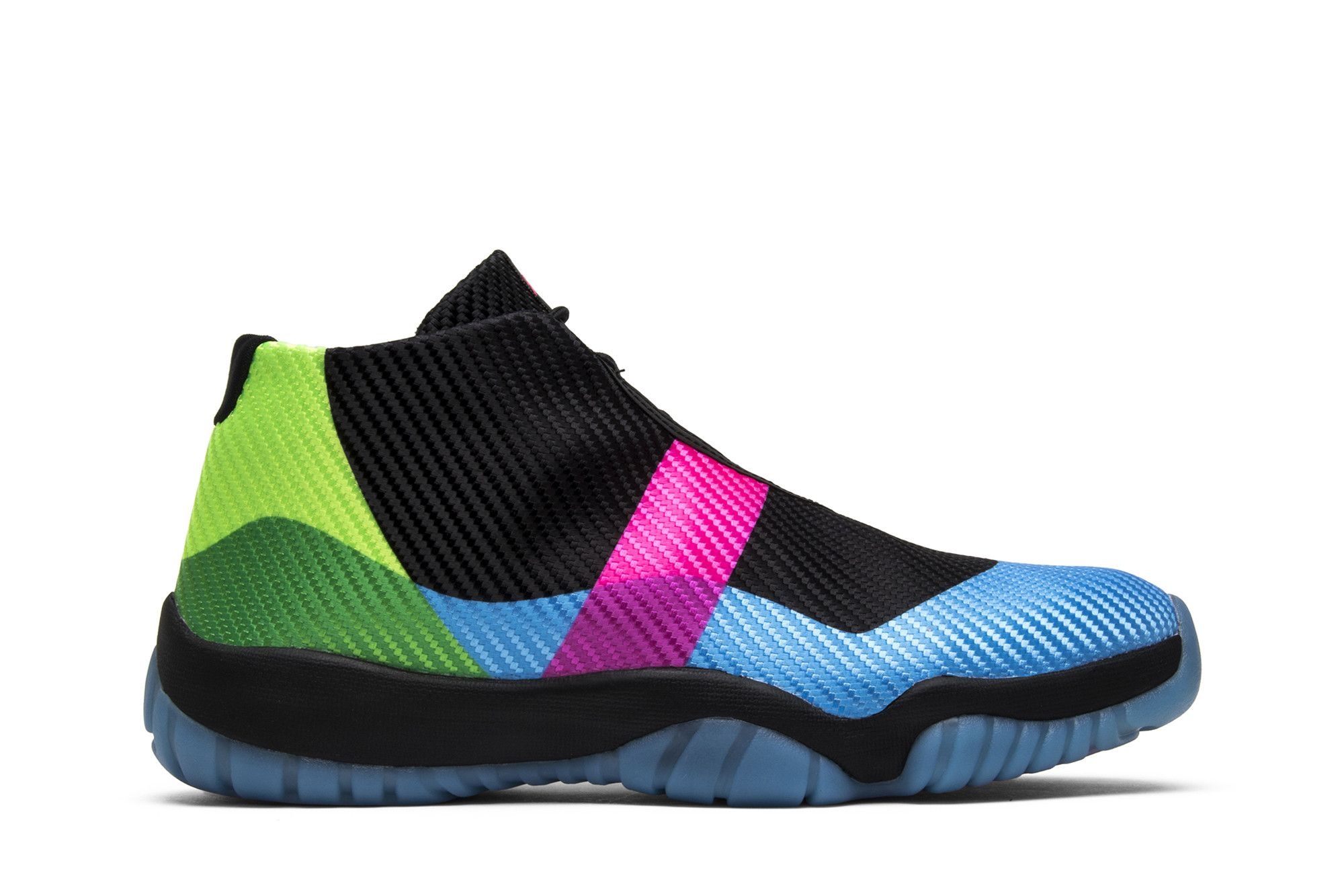 Jordan Brand’s sleek lifestyle silhouette takes on an eye-catching colorway in honor of the annual streetball competition known as Quai 54. Its signature blue, pink, and green hues accent the black woven upper on the Jordan Future ‘Quai 54,’ complemented by asymmetrical laces and a matching black midsole underneath. Additional pops of pink appear on the small Jumpman logo on the tongue, while the partially translucent rubber outsole is finished in blue.