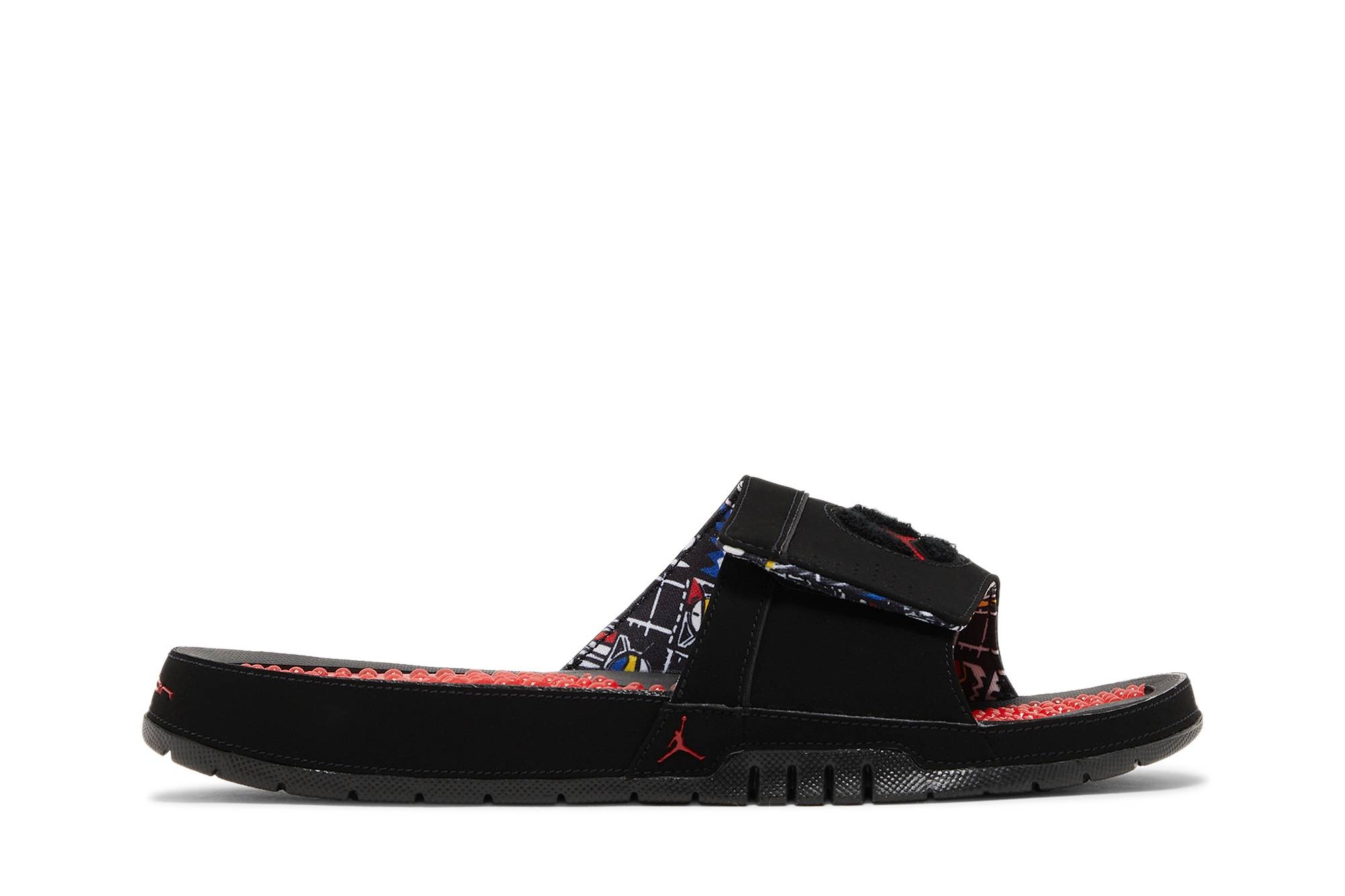 The Jordan Hydro 8 Retro Slide ‘Playoff’ takes inspiration from the shoe that Michael Jordan wore when he clinched his third NBA championship. A chenille Jumpman patch decorates the wide-strap upper, built with black synthetic nubuck and lined in patterned textile. Finished in University Red, a textured footbed provides a massaging sensation with every step. A debossed Jumpman graces the outsole, featuring flex grooves for improved traction and a comfortable stride. UPPER MATERIAL Nubuck