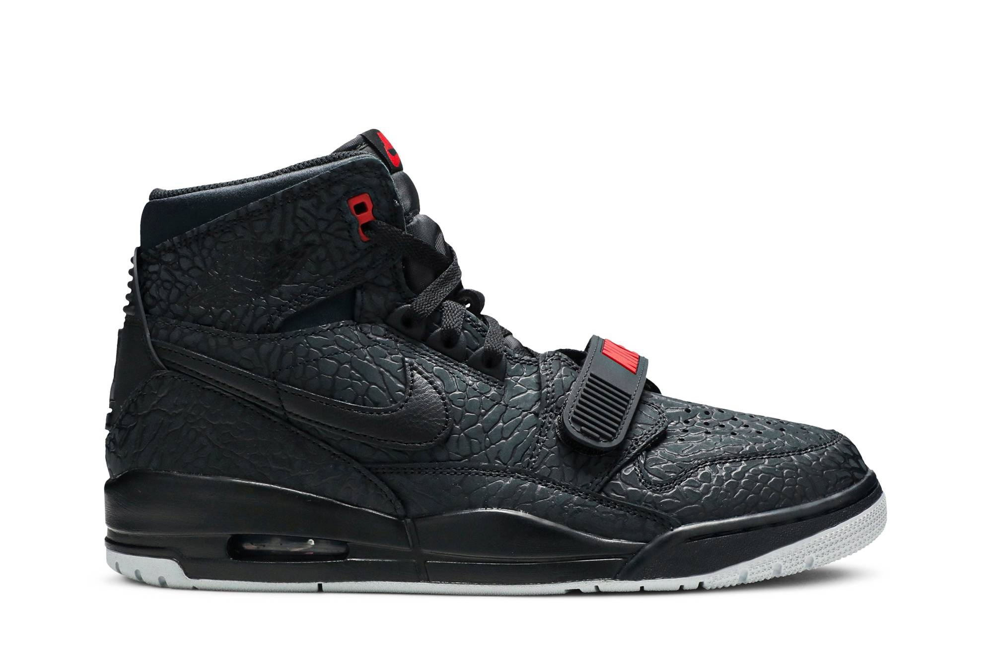 In collaboration with streetwear icon Don C, the Air Jordan Legacy 312 'Elephant Print' sneaker is revealed with references to the brand's history and both the designer and athlete's Chicago heritage. The January 2019 sneaker reaches back to the 3Lab5—a silhouette that combined elements from the third and fifth editions— with an allover Elephant Print. Red accents stand out on the strap, tongue, and eyelets. Full-grain Swooshes are embroidered on the lateral sides. The multicolor sole features a visible Air unit.