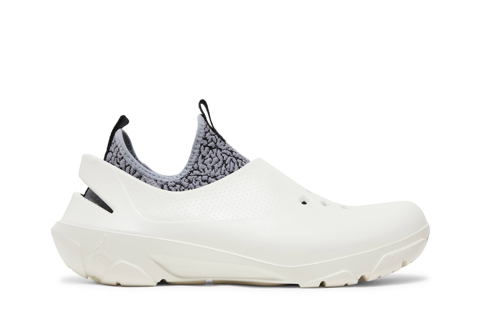 The Jordan System.23 ‘Sail Cement’ delivers Jordan Brand’s take on the comfort slip-on. The iconic elephant print embellishes the removable interior bootie, made with grey stretchy textile and equipped with dual webbing pull tabs for easy on and off. The sock-like sleeve is housed in a lightweight foam shell in a subtle off-white finish. Perforations atop the vamp offer improved breathability, while a molded heel strap provides a secure fit. Visible branding is limited to an embossed Jumpman on the lateral heel. UPPER MATERIAL EVA
