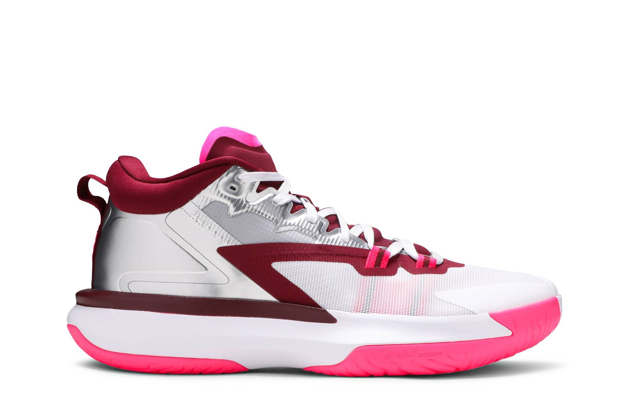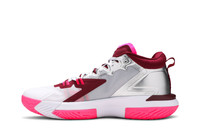 The Jordan Zion 1 ‘Marion’ draws inspiration from Zion Williamson’s South Carolina roots — specifically, the young athlete’s hometown when he first played basketball in middle school. The white textile upper is fortified with a metallic silver heel overlay and accented with pink and burgundy accents. The latter hue is repeated on the padded collar and articulated tongue, as well as a large ‘Z’ formation on the lateral side panel. Pink webbing straps are integrated into the laces for forefoot lockdown, while a full-length Air Strobel is stitched directly to the upper for responsive cushioning. A stacked Zoom Air unit in the forefoot provides added energy return. UPPER MATERIAL Mesh