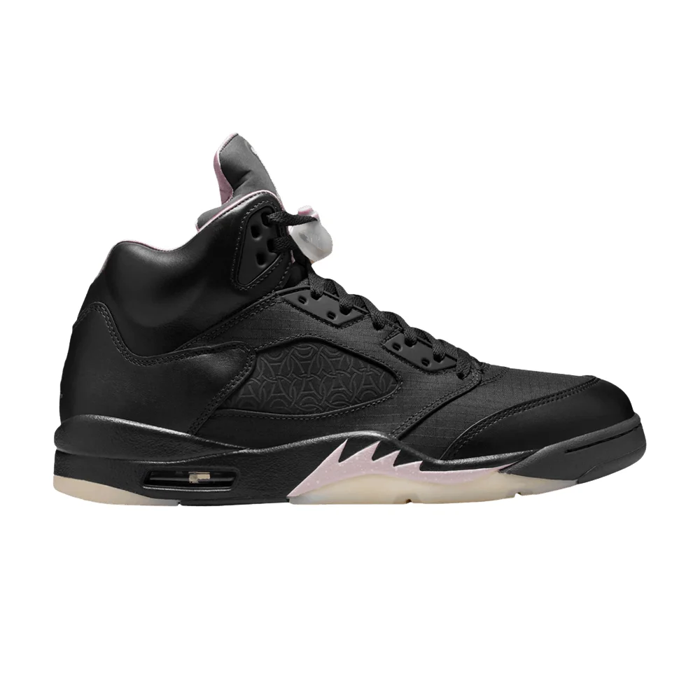 The Paris Saint-Germain x Air Jordan 5 Retro 'Off Noir' features a blacked-out upper that combines smooth leather construction with ripstop textile on the midfoot overlay and toe box. The traditional quarter panel netting is replaced with black nubuck covered in PSG's debossed Eiffel Tower logo in a repeating pattern. An embroidered Jumpman in Particle Rose adorns the reflective tongue, matching the satiny collar lining. Soft pink shark tooth detailing adorns the Air-assisted black polyurethane midsole, supported underfoot by a pre-aged translucent rubber outsole.